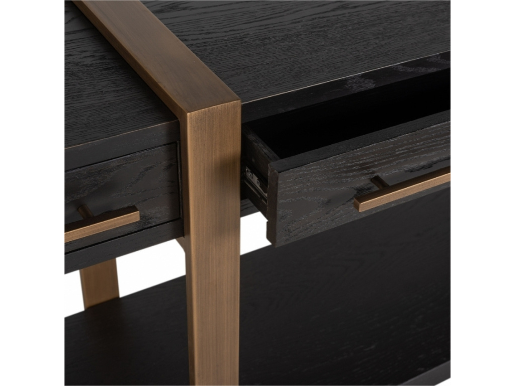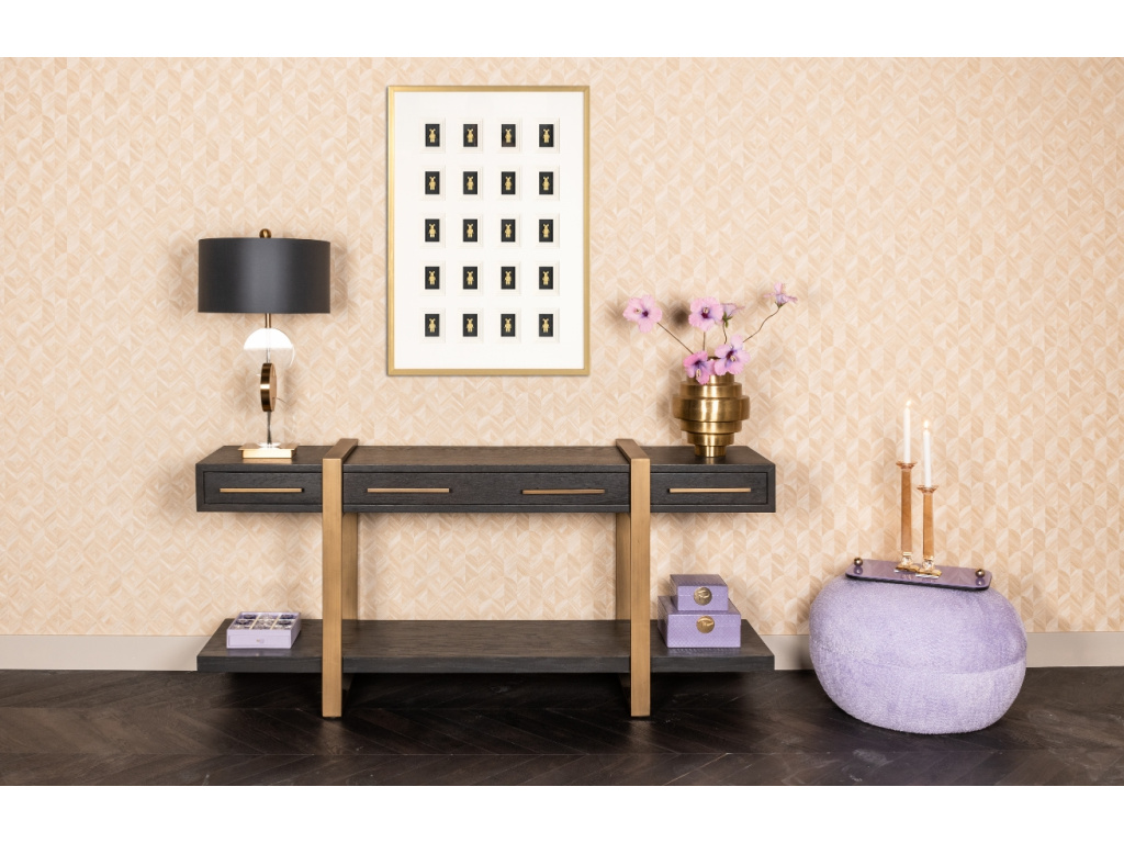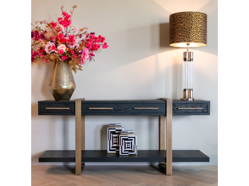 Elegantní stolek Cambon od značky Richmond dodá interiéru nádech luxusu a dynamiky. Jeho černá dubová deska s úložnými zásuvkami spočívá na štíhlé kovové podnoži v mosazném odstínu, která vytváří vzdušný a harmonický kontrast. Díky prostorné spodní polici nabídne dostatek místa pro dekorace nebo uložení potřebných věcí. Stane se nejen praktickým, ale i výrazným prvkem industriálně laděného či moderního interiéru. Perfektně doplní vstupní halu, obývací pokoj nebo ložnici.