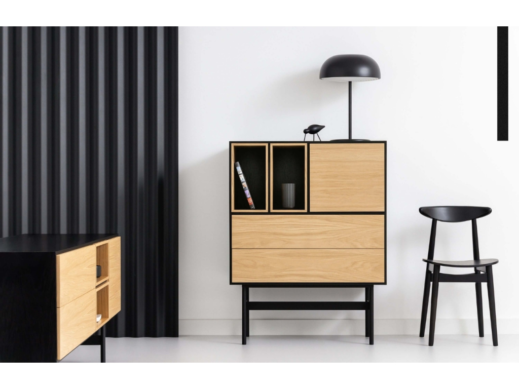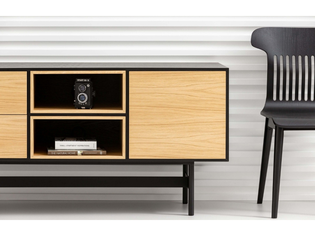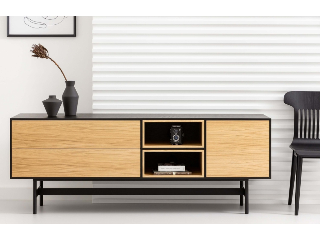 Černý TV stolek Maya od značky take me HOME nabízí praktický úložný prostor v podobě 2 prostorných zásuvek, 2 otevřených a 2 uzavřených polic s dvířky. TV stolek Maya si najde své místo nejen v moderních obývacích pokojích. Obdélníkový matně černě lakovaný korpus z dubové dýhy je kontrastně doplněn čelem z dubové dýhy, která je zanechaná v přírodním dubovém odstínu. Zkombinujte tento kousek také s ostatními produkty řady Maya a získejte díky tomu dokonalou souhru nábytku ve vašem interiéru.