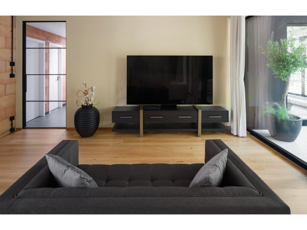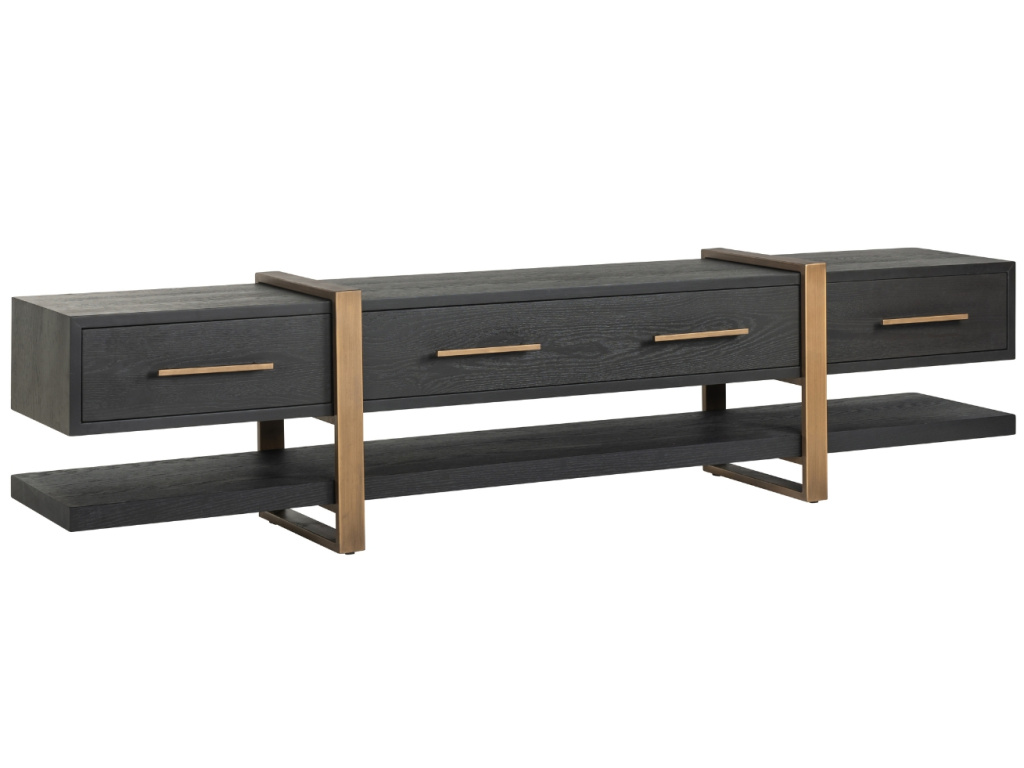 Precizní a vzdušný design TV stolku Cambon od značky Richmond uvítá každý industriálně a moderně zařízený interiér. Elegantní kovová podnož mosazné barvy objímá horní desku s úložnými zásuvkami a prostornou spodní polici. Cambon hravě zaplní prostor určený pro váš televizor a do obývacího prostoru vnese dynamickou, luxusní atmosféru. Deska i police jsou vyrobeny z dubové dýhy v elegantní černé barvě. Vpusťte do svého domova osobitost a šarm nábytku z kolekce Cambon.
