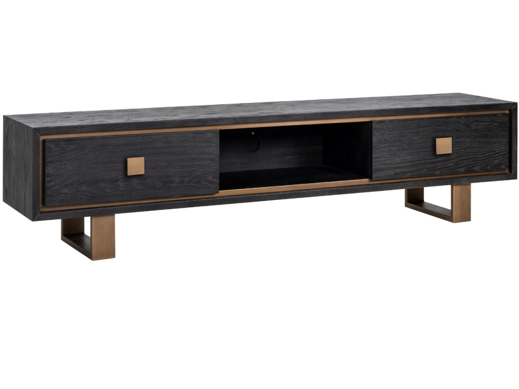 TV stolek Richmond Hunter je vyroben z černé dubové dýhy, kterou zdobí mosazně zbarvené detaily. Stejný barevný odstín má také jednoduchá, ryze industriální podnož, díky které má celkový design velmi příjemný kontrast. Stolek disponuje otevřenou policí s přístupem pro kabely a dvěma prostornými zásuvkami. Hunter můžete doplnit také komodou nebo nádherným regálem ze stejné kolekce a sjednotit tak styl ve vašem moderním interiéru.