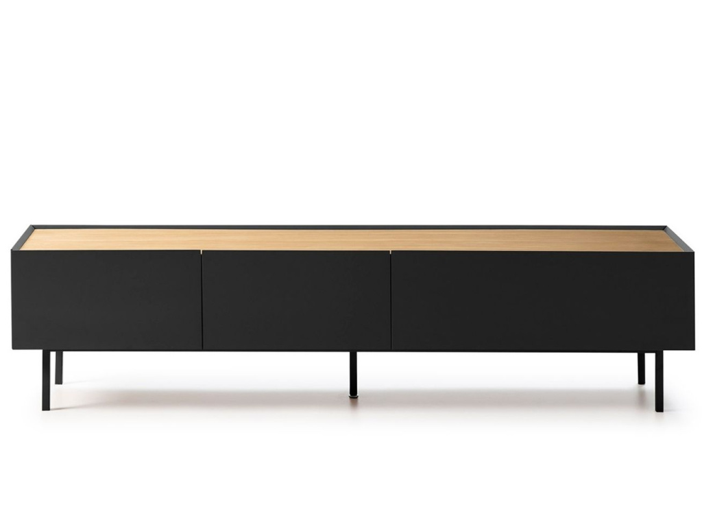 TV stolek Teulat Arista bude stylovou ozdobou každého moderního interiéru a obývacího pokoje. Dominantní černá barva podtrhuje minimalistický design stolku, se kterým kontrastuje vrchní deska s dubovou dýhou v přírodním odstínu. Úložný prostor je prakticky rozčleněn do jedné vysouvací zásuvky a dvou s výklopnými dvířky, což vám bude ulehčovat organizaci vašeho inventáře. Moderní styl komody podtrhuje tenká lakovaná kovová podnož, která barevně ladí se zbytkem stolku.