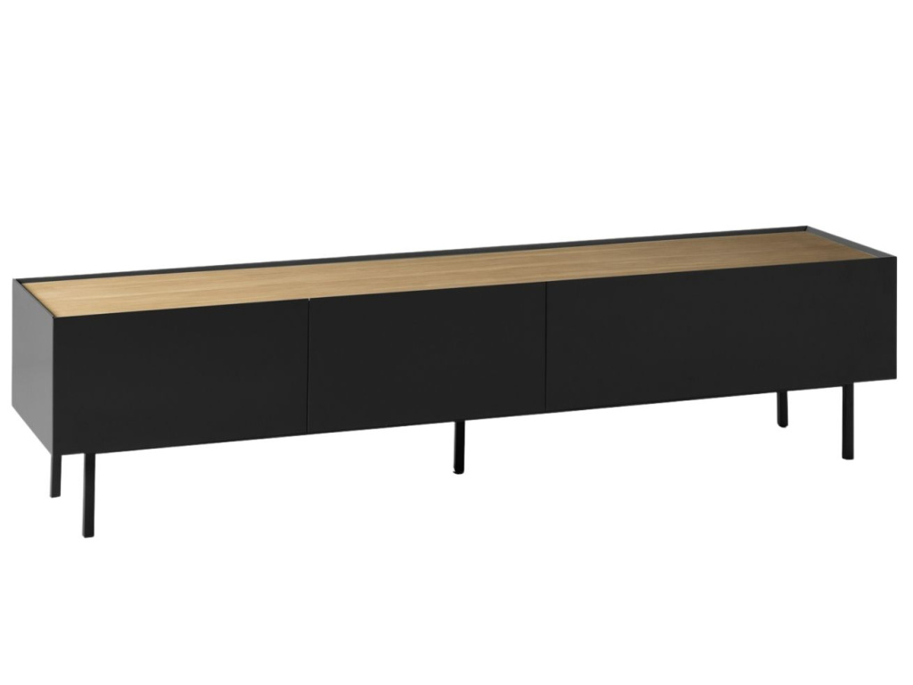 TV stolek Teulat Arista bude stylovou ozdobou každého moderního interiéru a obývacího pokoje. Dominantní černá barva podtrhuje minimalistický design stolku, se kterým kontrastuje vrchní deska s dubovou dýhou v přírodním odstínu. Úložný prostor je prakticky rozčleněn do jedné vysouvací zásuvky a dvou s výklopnými dvířky, což vám bude ulehčovat organizaci vašeho inventáře. Moderní styl komody podtrhuje tenká lakovaná kovová podnož, která barevně ladí se zbytkem stolku.
