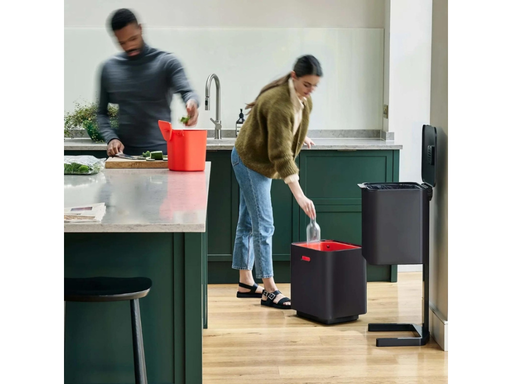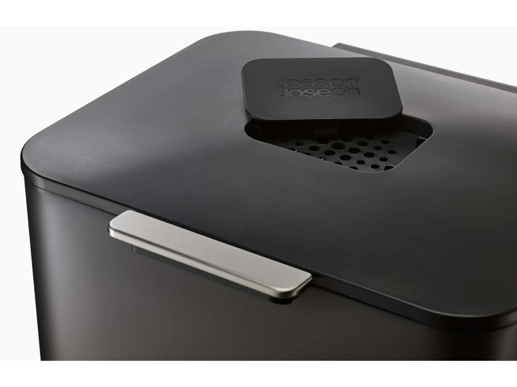 Sada kovových košů Totem od Joseph Joseph se stane nepostradatelným pomocníkem v každé moderní domácnosti. Totem nabízí hned několik funkcí - v každé sadě najdete dva nad sebou umístěné plastové koše o obsahu 30 l v kovových korpusech. Díky tvarovaným okrajům s drážkami snadno uchytíte sáčky na odpadky. Rohové zkosení vnitřních košů usnadňuje jejich vyjmutí z korpusu. Každá sada košů je doplněna malou odnímatelnou nádobkou na zbytky potravin nebo bio odpad. Nádobka lze upevnit k okraji horního koše. Pro snadné plnění je možné nádobku postavit přímo na pracovní plochu a víčko zaklesnout úchytkou na hranu horního koše. Díky výměnnému uhlíkovému filtru, který se postará o nepříjemný zápach, není nutné koše vynášet před jejich úplným naplněním.