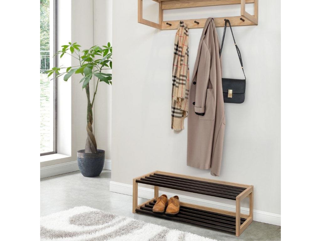 Kombinace kovu a dřeva dodává botníku Slussen od značky Woodman moderní vzhled, který dodává předsíni na osobitosti a stylu. Masivní dubový rám v přírodní barvě v kombinaci s kovovými policemi pro až 8 párů bot se bude vyjímat, jak v moderním, tak i klasickém designu.