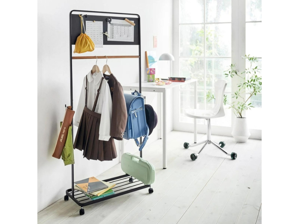 Pojízdný dětský věšák Tower od značky Yamazaki je vyroben z černě lakovaného kovu a bude elegantním doplňkem nejen do dětského pokoje. Tower nabízí šatní tyč z bukového dřeva na pověšení ramínek. Také disponuje dolní policí na uložení tašek nebo bot. Součástí věšáku je i magnetická nástěnka či háčky k pověšení batohů a tašek. Výhodou věšáku Tower jsou kolečka, která zajišťují snadnou manipulaci po prostoru.