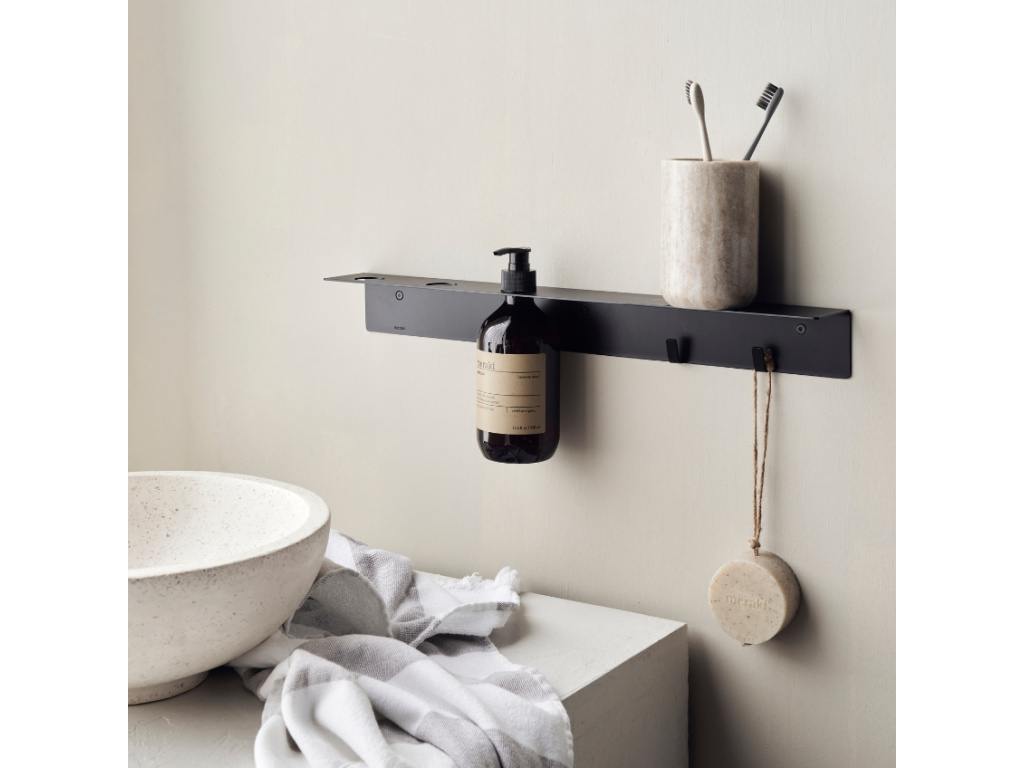 Nástěnný držák Supply od Meraki bude vaším pomocníkem v koupelně či v kuchyni. Bude se vám hodit k uskladnění vašich oblíbených krémů nebo mycích prostředků či k zavěšení utěrky a různých doplňků. Najdete na něm tři otvory na lahve Meraki a dva háčky. Supply je vyrobený z nerezové oceli s broušeným černým povrchem, který nepropustí žádnou vodu. Držák bude stylovým doplňkem a zároveň pomůže udržovat pořádek.