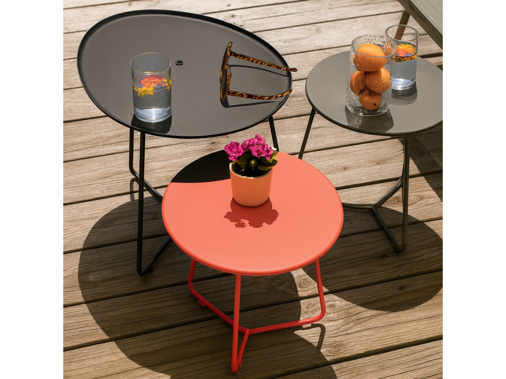 Moderní design a praktické provedení, které si zamilujete hned na první pohled. To je konferenční stolek Fermob Cocotte. Má odnímatelnou desku, která lze využít jako podnos. To velice usnadní přenášení například drobného občerstvení z kuchyně na terasu. Podnož z oceli je bytelná a opatřena protiskluzovými chrániči. Deska je vyrobena z hliníku, díky čemuž je stolek nejen lehký, ale také velmi odolný na venkovní použití. Je vyráběn z prvotřídních materiálů a testován tak, aby splňoval standardy kvality evropských norem (NF EN 581-1 a NF EN 581-2). Exkluzivní systém antikorozní úpravy pro venkovní použití a anti-UV práškový lak (standardizované testy AFNOR) dělá ze stolku ideálního společníka.