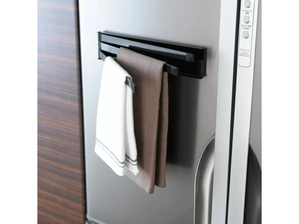 Magnetický držák na utěrky Tower od značky Yamazaki je elegantní a praktický doplněk do každé kuchyně. Držák je vyrobený z černě lakovaného kovu a disponuje třemi výklopnými rameny, která umožňují snadné zavěšení více utěrek najednou. Jeho magnetický design umožňuje snadné a flexibilní umístění na jakýkoli kovový povrch, jako jsou lednice nebo kovová dvířka. Tower může být použit i v koupelně na ručníky nebo v dílně na zavěšení různých hadříků a textilií.