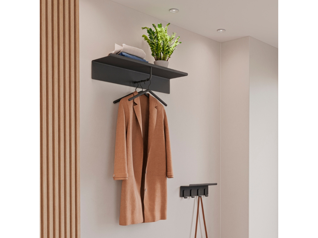 Stylový nástěnný věšák A-Collection od dánské značky Zone Denmark je tvořen z praktické kovové police s kolmou tyčí na šatní ramínka, která zachová krásu vašich kabátů a jiných svršků. Díky důmyslnému minimalistickému designu se nemusíte bát, že by se váš kabát nepříjemně zmačkal. Velká police zároveň nabízí dostatek prostoru pro různé doplňky, jako jsou například deštníky či klobouky. Věšák do předsíně je vyroben z kvalitní práškově lakované oceli v atraktivní černé barvě. Vytvořte si stylový set s malým černým nástěnným věšákem A-Collection.