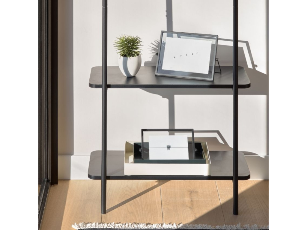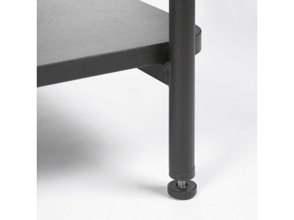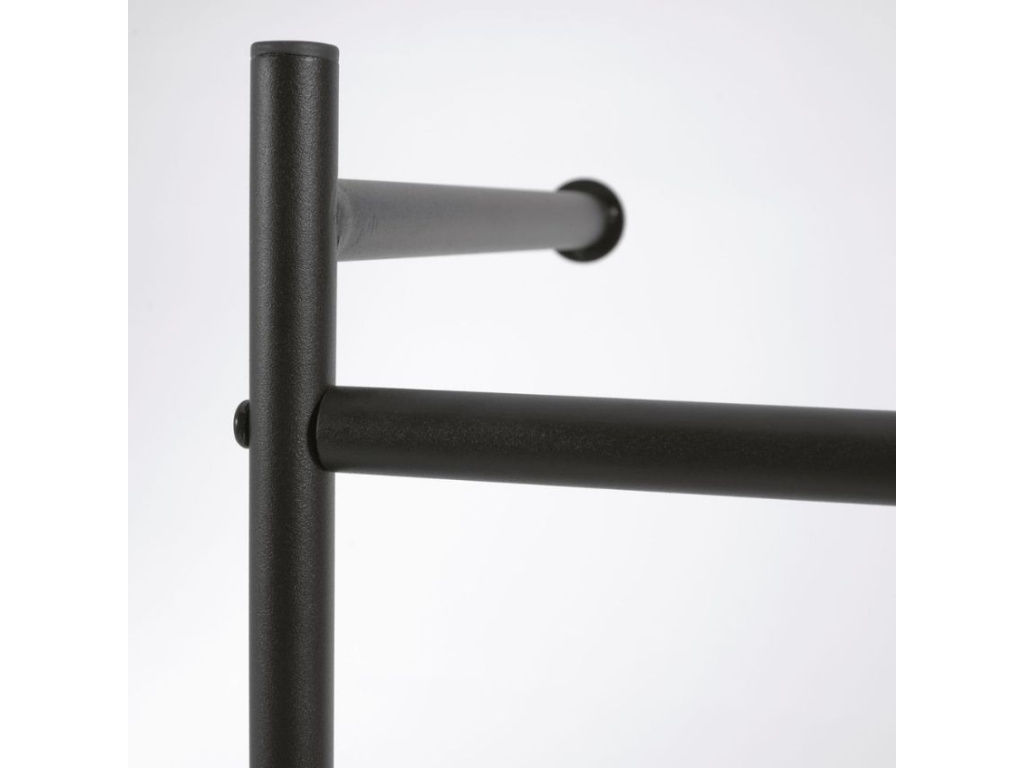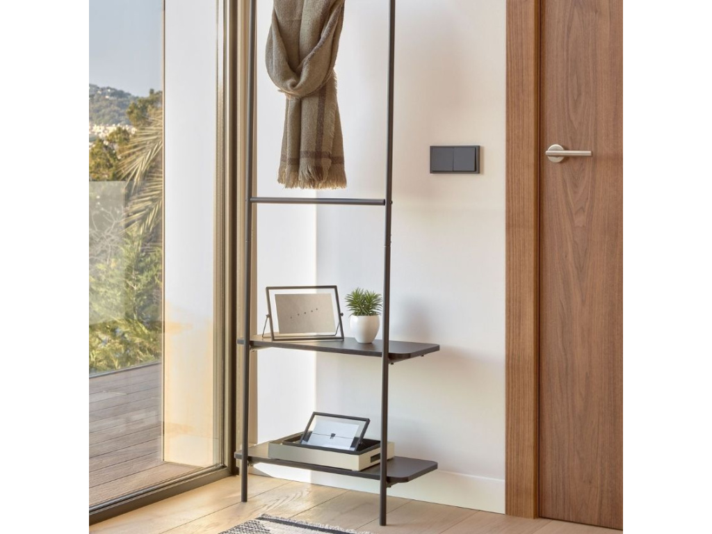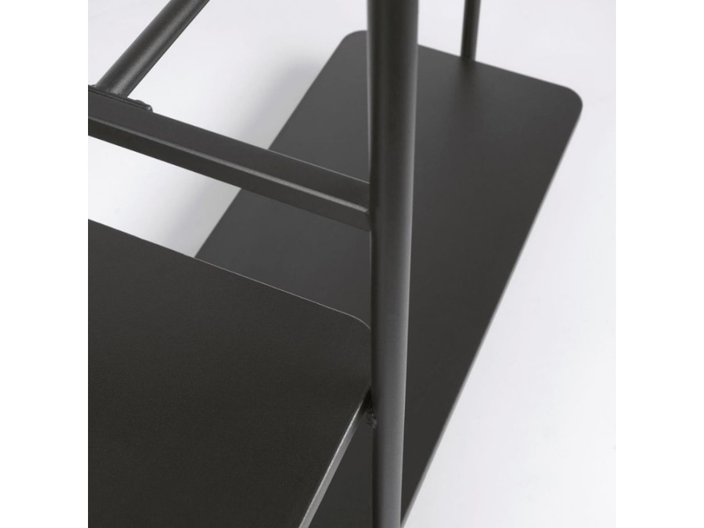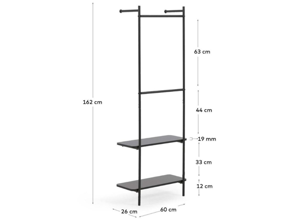 Nástěnný věšák Kave Home Galatia vám pomůže uspořádat oblečení ve vaší předsíni, šatně či ložnici. Věšák disponuje dvěma závěsnými tyčemi a dvěma policemi. Konstrukce a podnož věšáku je vyrobena z černě lakovaného kovu a jeho police tvoří černý melamin, který vyniká svojí odolností. Věšák můžete využít také jako regál a umístit ho třeba do pracovny. V sérii Galatia najdete další produkty, které lze v interiéru skvěle kombinovat.
