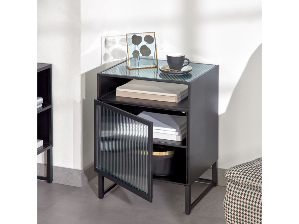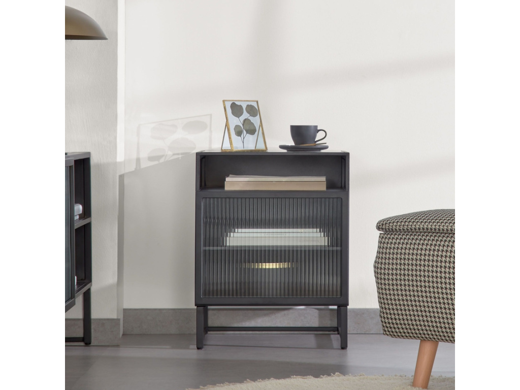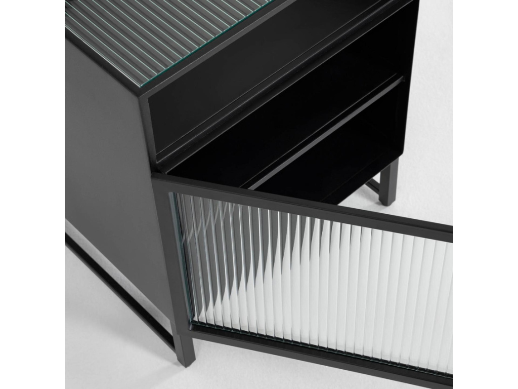 Elegantní noční stolek Kave Home Trixie ukazuje krásu a sílu ve svém celokovovém provedení. Tři police zajistí prostorné úložiště pro váš inventář. Svou dokonalost ukazuje především díky prosklené vroubkované desce a dvířkům, které stolku dodají na originalitě a osobitosti. Stolek se hodí industriálně zařízených interiérů.