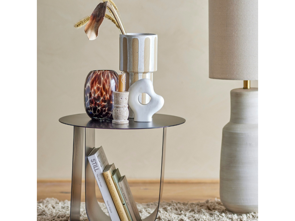 Odkládací stolek Bloomingville Cher si získá vaši pozornost svým originálním tvarem. Deska i podnož stolku jsou vyrobeny z pevného lakovaného kovu v elegantní černé barvě. Součástí podnože je zaoblená deska, která může sloužit jako praktický úložný prostor na knihy a časopisy. Stolek skvěle zapadne především do moderních či minimalisticky laděných interiérů.