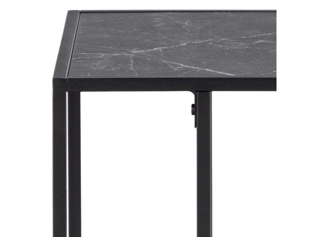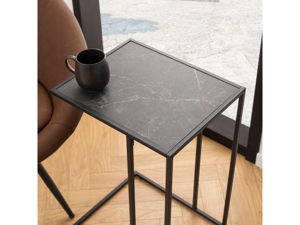 Rowan je odkládací stolek černé barvy. Jeho deska je z pevného laminátu, který má dekor mramoru a je doplněná kovovou podnoží. Ta je po stranách zpevněná, což zaručuje maximální stabilitu stolu.
