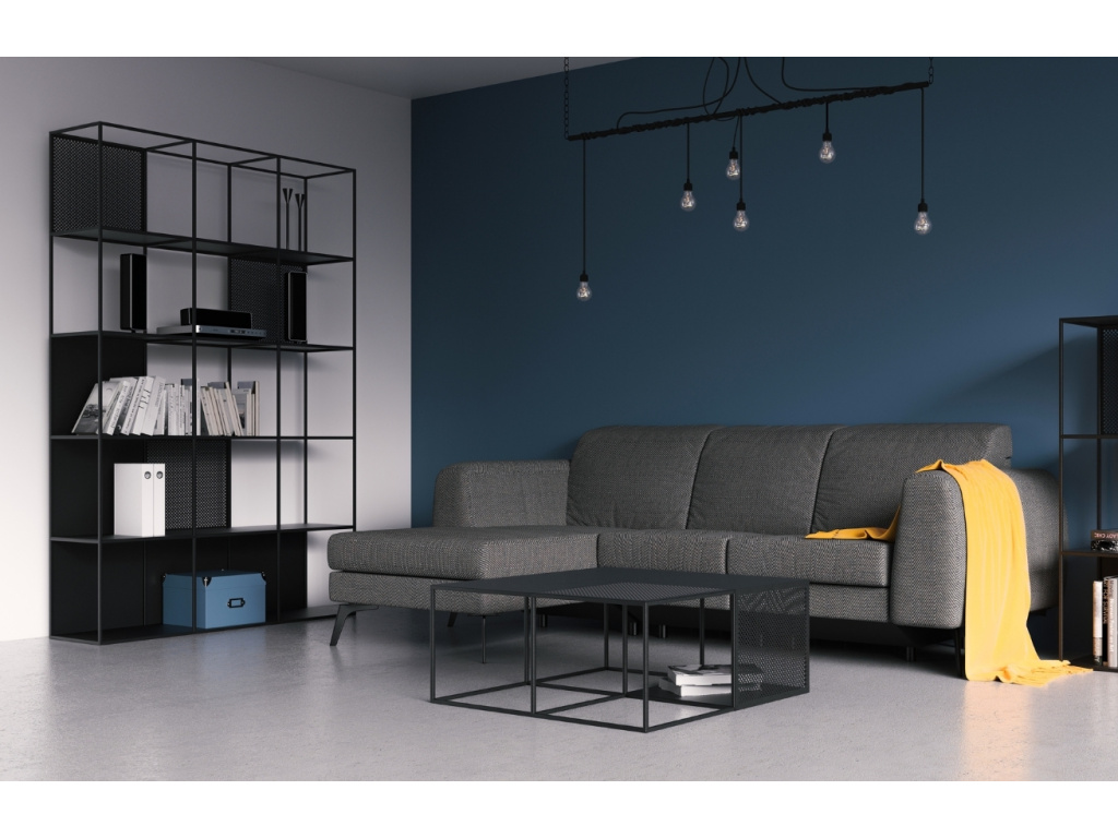 Moderní a minimalistický regál Motivo je vyrobený z vysoce kvalitního lakovaného kovu. Regál kombinuje otevřené i uzavřené police, z nichž některé jsou ozdobené pravidelnou perforací, která dodává celku originální prvek. Hodí se do moderních interiérů s tmavými prvky a k produktům ze stejnojmenné řady.