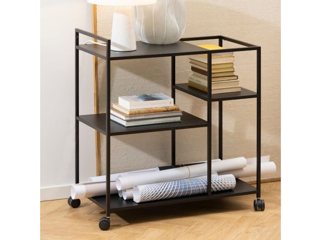 Servírovací vozík Renna vnese industriální prvek do vašeho interiéru. Vozík je černý, celokovový, matný, má elegantní linie a zpevněnou podnož. Zajisté oceníte otočná kolečka a velký úložný prostor, který vozík má.