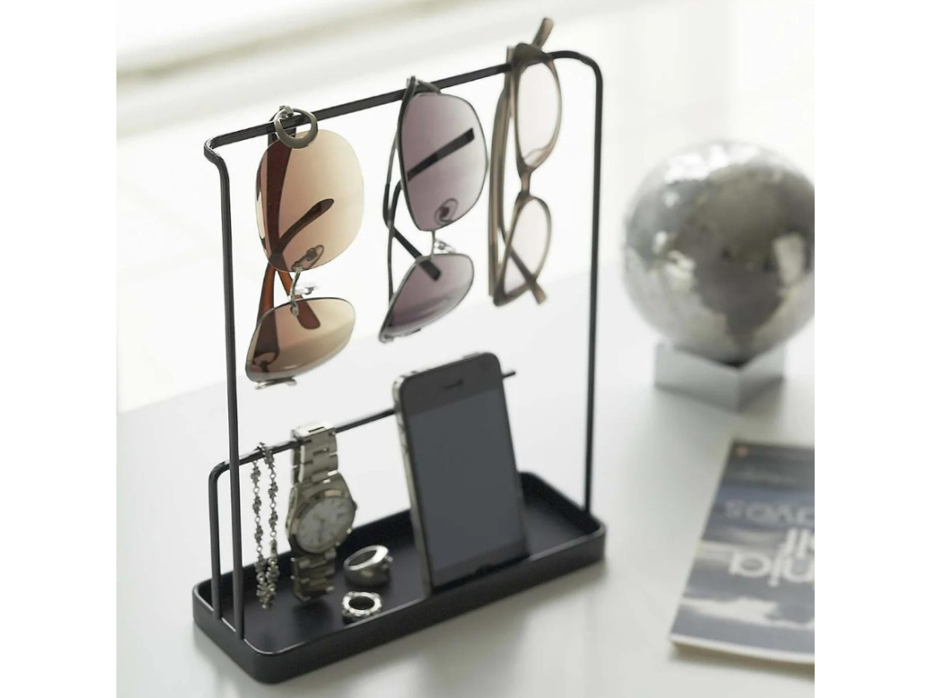 Stojan Tower od značky Yamazaki je nejen praktickým, ale i stylovým řešením pro uspořádání vašich osobních věcí. Stojánek je vyroben z lakovaného kovu a jeho minimalistický design se snadno začlení do jakéhokoliv interiéru. Horní konzolka je ideální pro zavěšení brýlí a další dvě konzolky poskytují prostor pro opření telefonu, zavěšení hodinek nebo odložení šperků. Díky své multifunkčnosti a elegantnímu designu se hodí do různých částí vašeho domova či kanceláře. Tento stojánek vám pomůže udržet pořádek a zároveň přidá moderní prvek do vašeho interiéru.