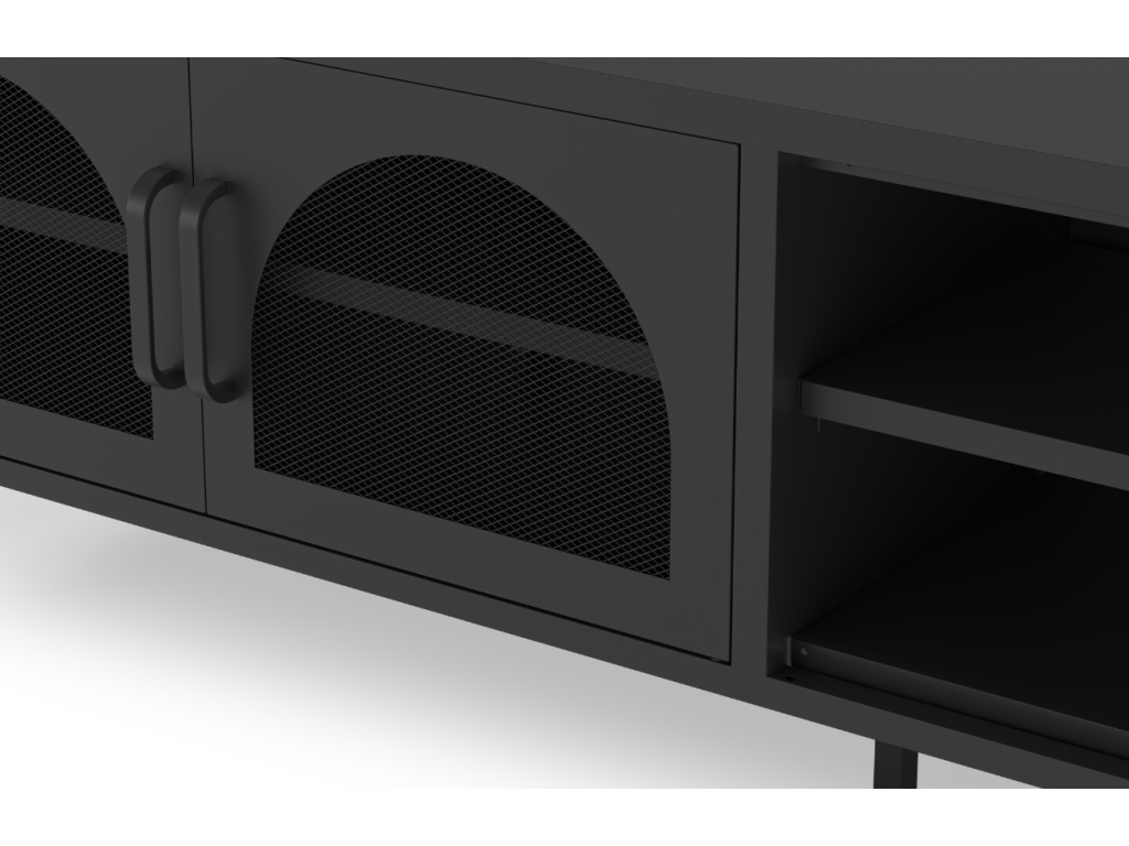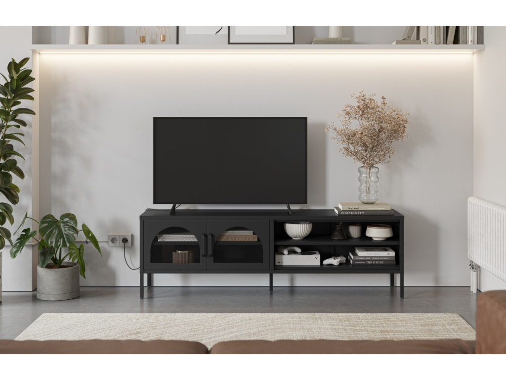 Černý TV stolek Diora je vyroben z práškově lakovaného kovu. Kovová dvířka se zaobleným perforovaným dekorem ukrývají praktický úložný prostor, další místo nabízejí dvě otevřené police. Díky své neutrální, nadčasové barvě a industriálnímu charakteru vynikne v retro i minimalistických interiérech. Kolekce Diora zahrnuje i noční stolky, komody a skříně v pěti stylových odstínech.