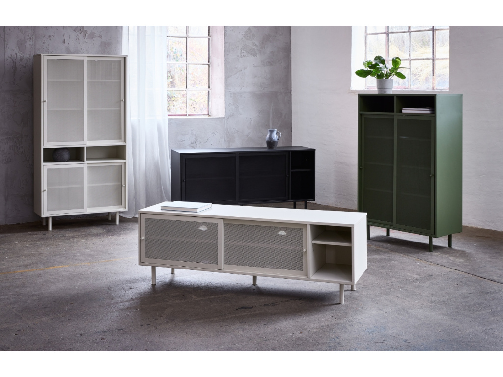TV stolek Veep od značky Unique Furniture ukazuje krásu a sílu ve svém celokovovém provedení. Unikátním prvkem jsou perforovaná dvířka, která dodávají stolku jedinečný charakter a zvýrazňují jeho moderní vzhled. Díky promyšlenému designu nabízí TV stolek dostatek úložného prostoru pro vaši elektroniku, dekorace a další potřebné věci. Skvěle se hodí nejen do obývacího pokoje, ale také do ložnice či jiných částí domu. Pro dokonalou harmonii v interiéru můžete tento stolek zkombinovat s ostatními produkty z kolekce Veep. Na výběr máte ze tří barevných variant – černá, šedá a olivově zelená – takže si snadno vyberete tu, která nejlépe ladí s vaším stylem.