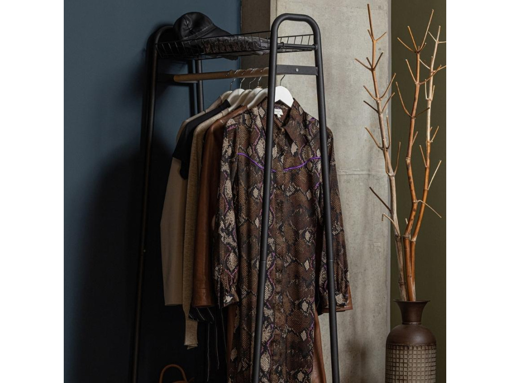 Designový věšák Jovich od značky Hoorns využijete nejen na zavěšení kabátů. Kovová konstrukce v matně černé barvě spolu s dřevěnou závěsnou tyčí tvoří dohromady stylový kontrast. Dvě drátěné police můžete využít k uložení svých doplňků, kabelek či bot. Praktický stojací věšák Jovich univerzálně poslouží v předsíni, šatně nebo i ložnici.