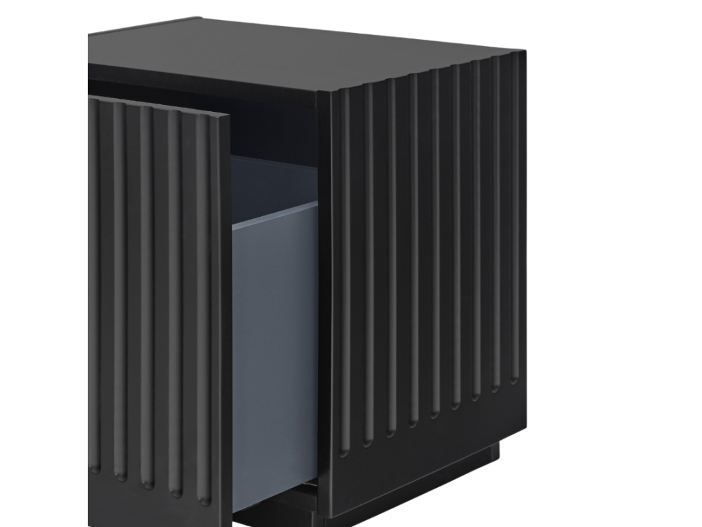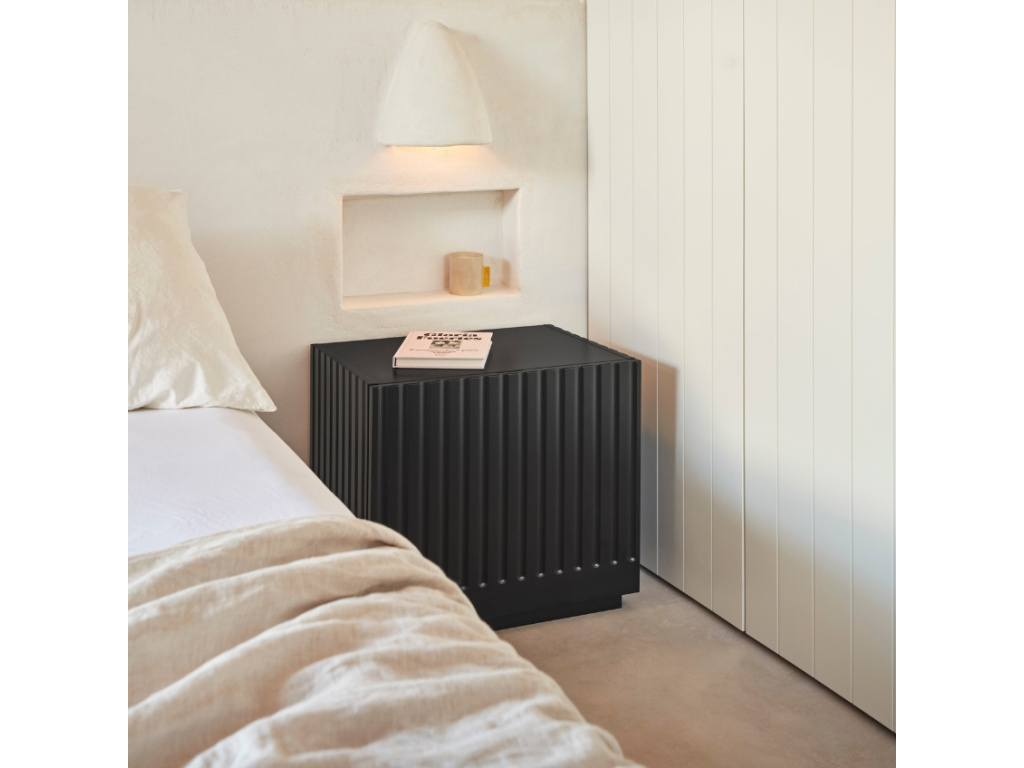 Minimalistický noční stolek Doric od španělské značky Teulat vám umožní mít vše důležité po ruce, když se pohodlně uvelebíte v posteli. Díky nadčasovému designu je ideálním doplňkem každého moderního interiéru. Zajímavým designovým prvkem je vzorek na předních dvířkách a po stranách, který nábytku dodává na osobitosti a stylu. Noční stolek je vyrobený z lakovaného MDF v elegantní černé barvě. Disponuje praktickou velkou výsuvnou zásuvkou.