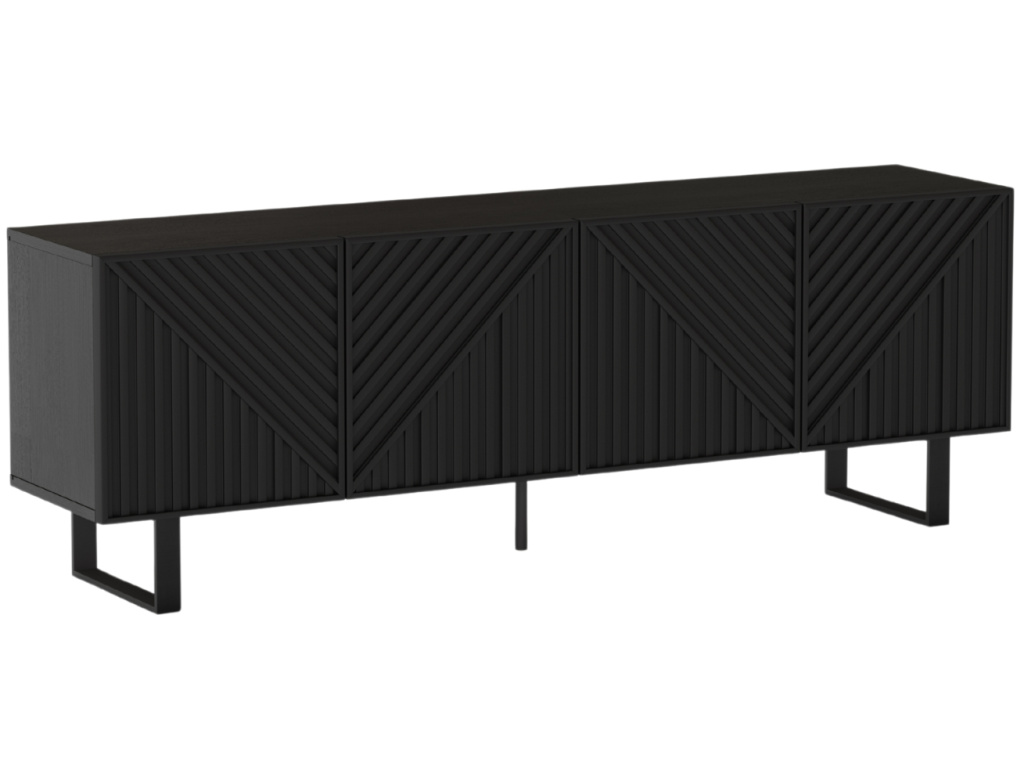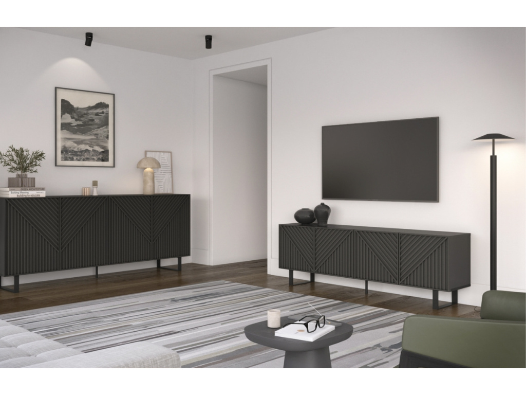 TV stolek Peta od značky Marckeric je designovým kouskem, který zaujme svými geometricky frézovanými dvířky a celkově výrazným charakterem. Černý lak na MDF deskách v kombinaci s kovovou podnoží vytváří moderní nábytek s industriálním nádechem. Za čtyřmi uzavíratelnými dvířky se ukrývají police, které nabídnou dostatek prostoru pro elegantní uschování všeho, co nemá být vidět. V kolekci Peta najdete kromě TV stolku také dvě varianty komod, které společně vytvoří charakter nápaditého a výrazného interiéru.