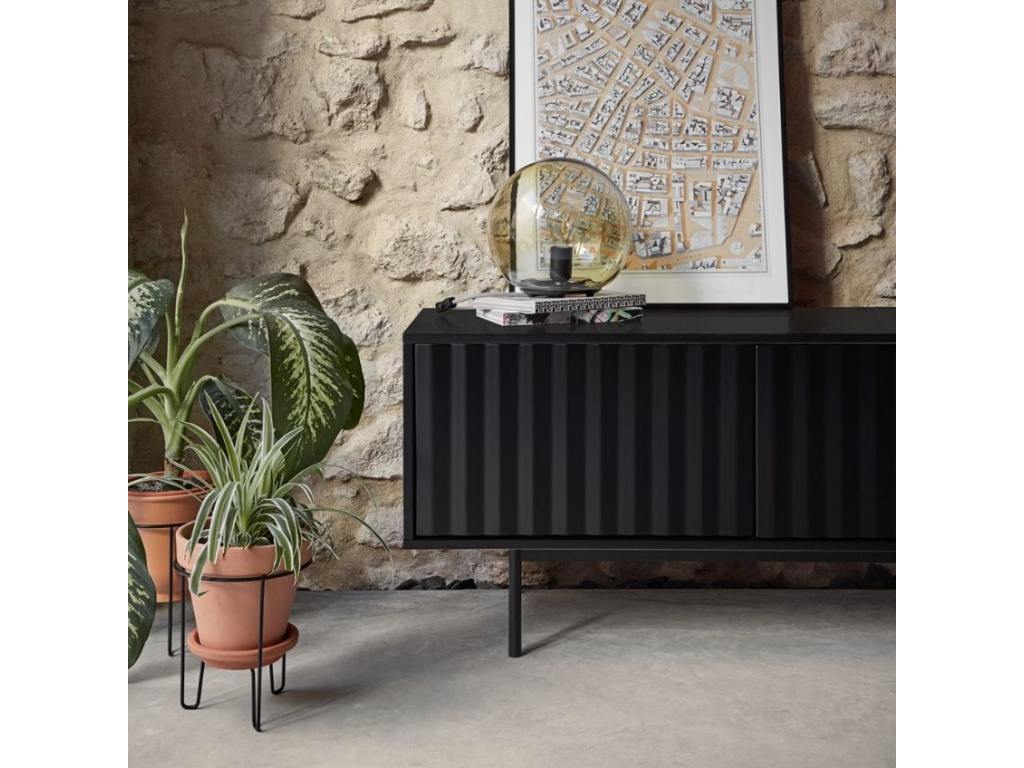 Stylový TV stolek Teulat Sierra zaujme na první pohled svým minimalistickým designem a harmonikovým vystouplým vzorem na předních dvířkách. Stolek je vyroben z lakovaného MDF v elegantní černé barvě. Celý korpus doplňuje tenká kovová podnož. Stolek disponuje praktickým úložným prostorem ve formě uzavřených polic. Teulat Sierra zejména vynikne v moderně laděných interiérech.