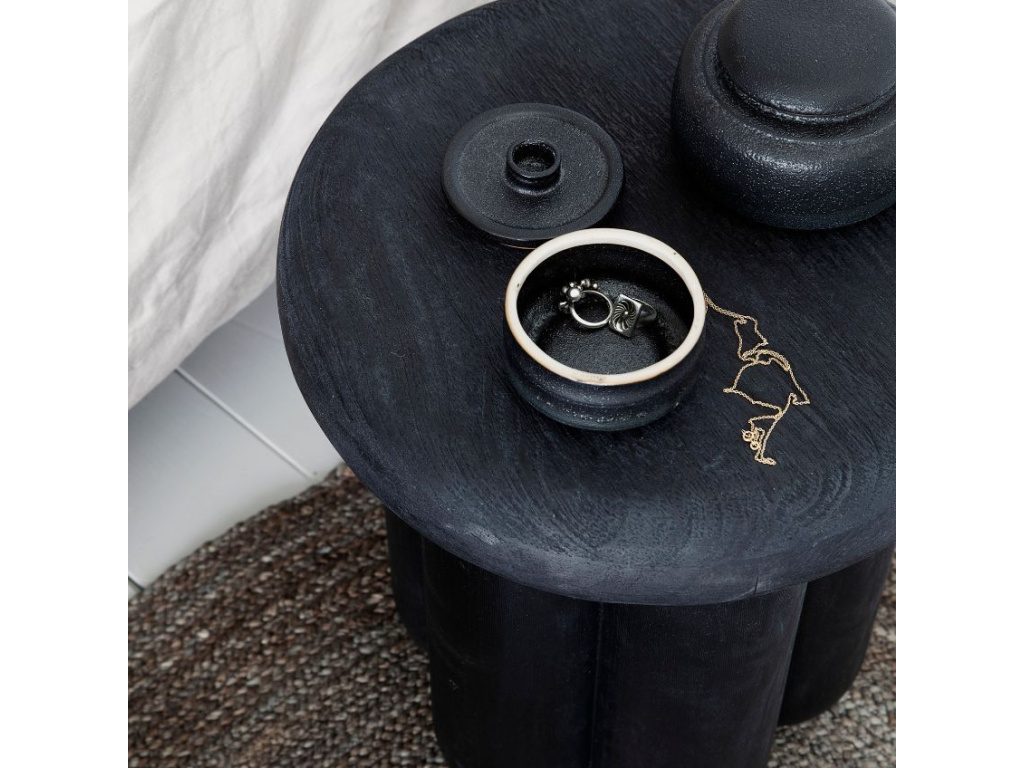 Odkládací stolek Phant je vyrobený z černě mořeného mangového dřeva - v interiéru vynikne zejména jeho výrazná kresba a surový vzhled. Díky černé barvě jej snadno skombinujete s doplňky a dekoracemi - skvěle bude vypadat například se zlatou barvou, se kterou vytvoří atraktivní kontrast. Využití ale najde nejen v obývacím pokoji! Perfektně bude vypadat také v ložnici vedle postele, kde poslouží jako noční stolek.