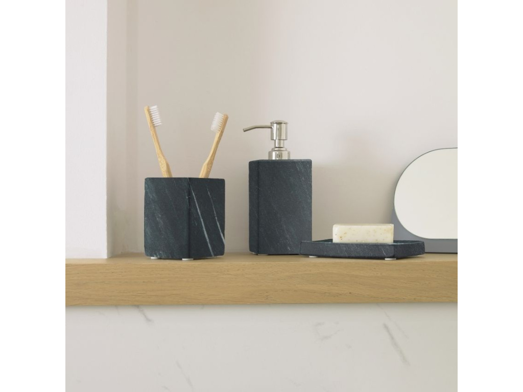 Doplňte vaši designovou koupelnu dávkovačem na mýdlo Kave Home Aixa. Je vyroben z černého mramoru a spolu s lesklou pumpičkou z nerezové oceli bude výraznou ozdobou každé moderní koupelny. Mramorový dávkovač na mýdlo je možné doplňovat opakovaně, čímž výrazně ulevíte životnímu prostředí. Doporučujeme kombinovat společně s mramorovým stojanem na zubní kartáčky Kave Home Aixa.