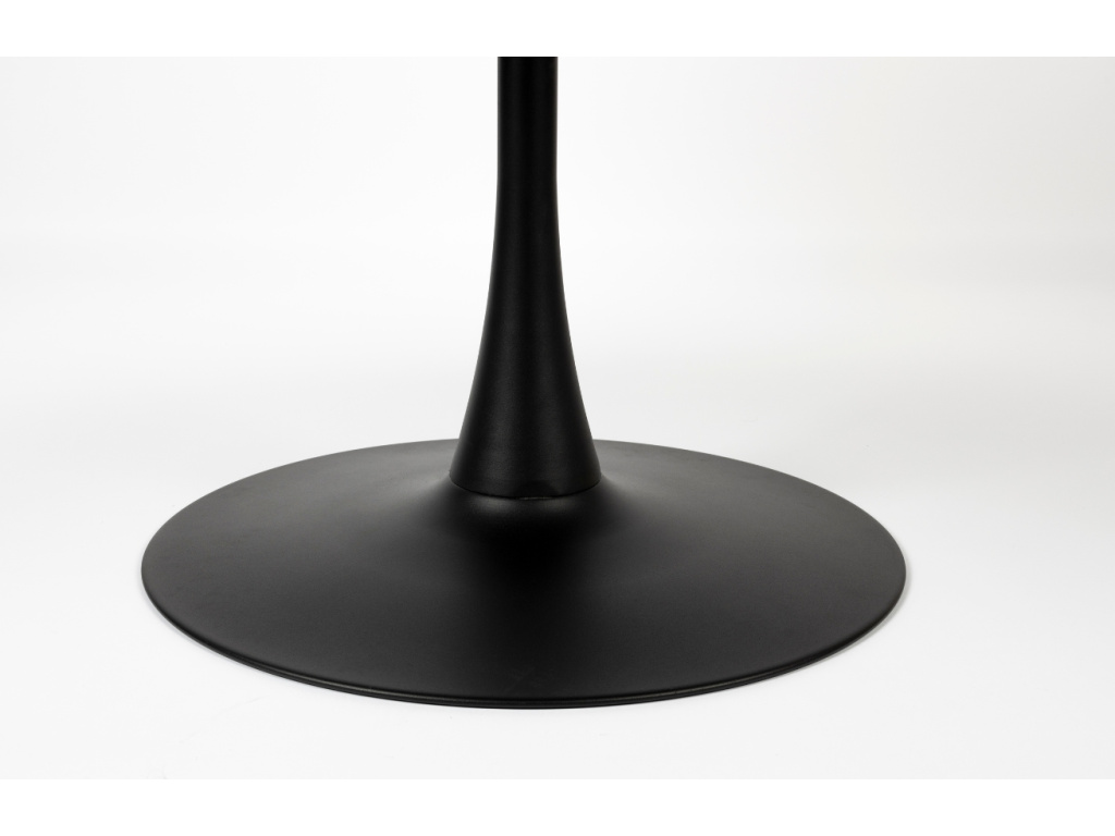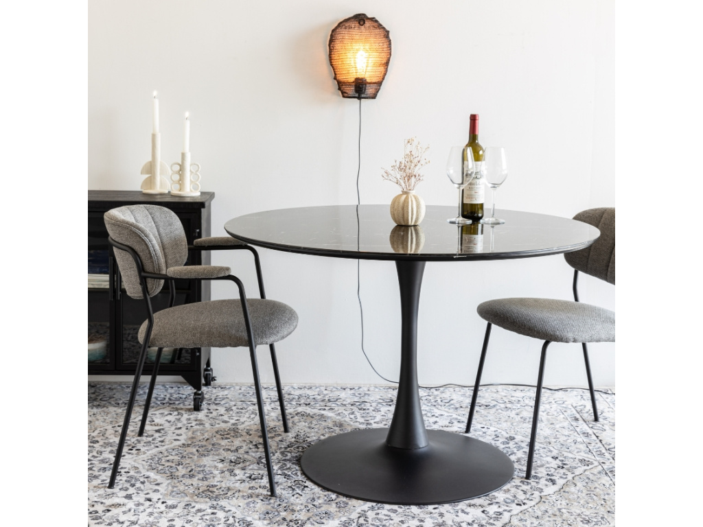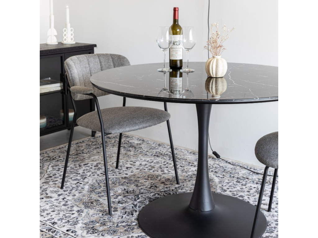 Kulatý jídelní stůl MARU značky WHITE LABEL LIVING vás nadchne dekorem své desky. Ten připomíná mramor atraktivního černého zbarvení. Tato mramorová folie dodá vaší jídelně nádech luxusu a elegance. Stůl stojí na elegantně tvarované kovové podnoži s kruhovou základnou a pohodlně se k němu vejdou 4 strávníci. Skvěle se k němu hodí čalouněné jídelní židle, slušet mu to například v kombinaci se světle šedou barvou.