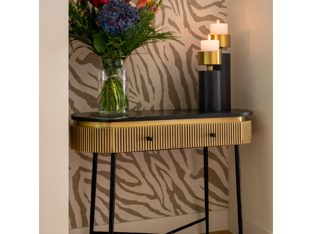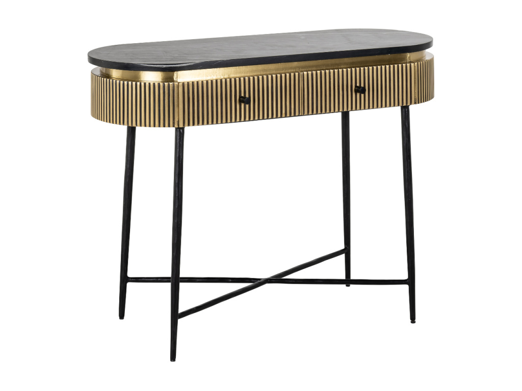 Dodejte svému domovu funkční eleganci s toaletním stolkem z produktové série Ironville od značky Richmond. Tento toaletní stolek kombinuje styl a praktičnost v nádherně zpracovaném celku. Design je inspirovaný industriálními prvky a disponuje dvěma zásuvkami pro více úložného prostoru a uložení předmětů, které není třeba mít na očích. Stolek Ironville bude všestranným doplňkem do vaší předsíně, ložnice nebo obývacího pokoje.