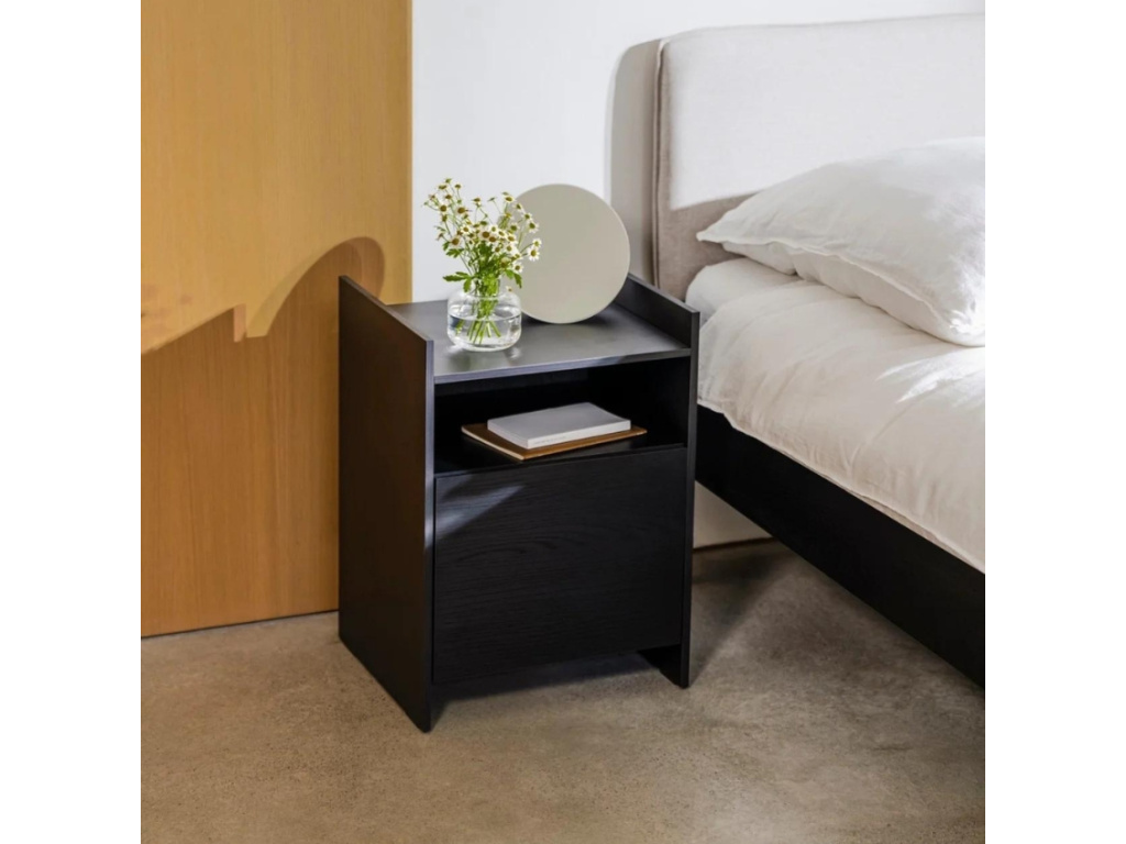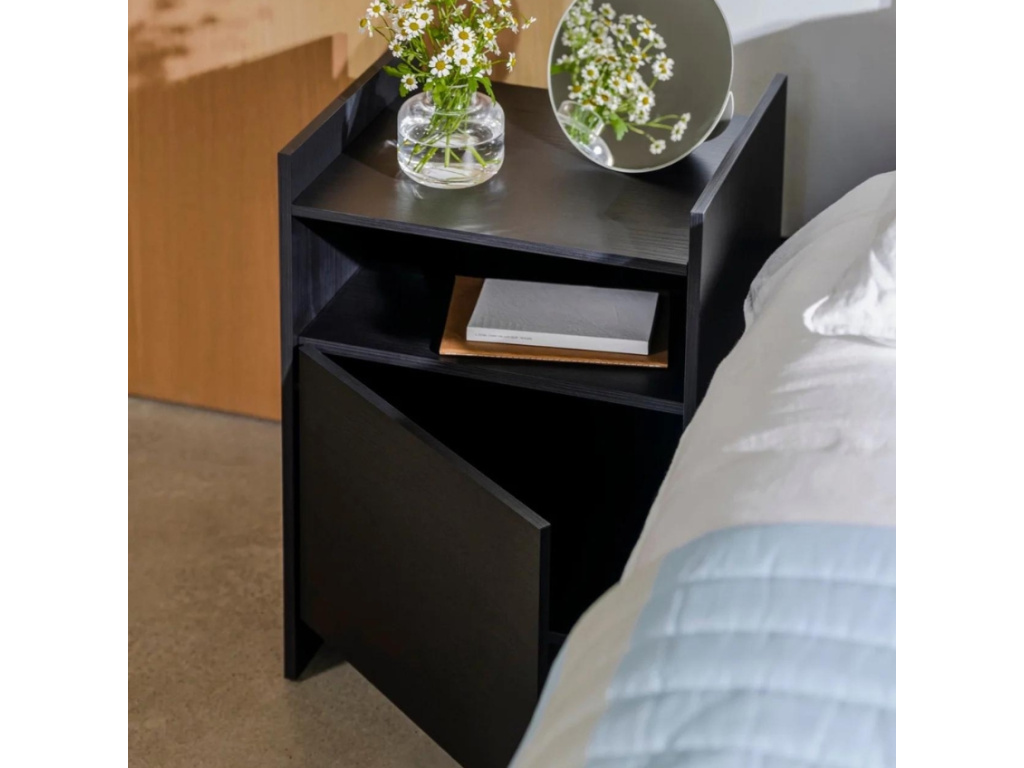 Designový noční stolek Toopt inspirovaný v minimalismu je charakteristický pro své provedení v černém dubovém dekoru, který mu dodává jistou eleganci. Toopt nabízí dostatek úložného prostoru v podobě uzavřené i otevřené police, kam bez problémů odložíte knihy, lampičku nebo brýle. Skvěle se hodí do všech interiérů ložnic a využít ho můžete klidně i kdekoliv jinde – sloužit může také jako odkládací stolek.