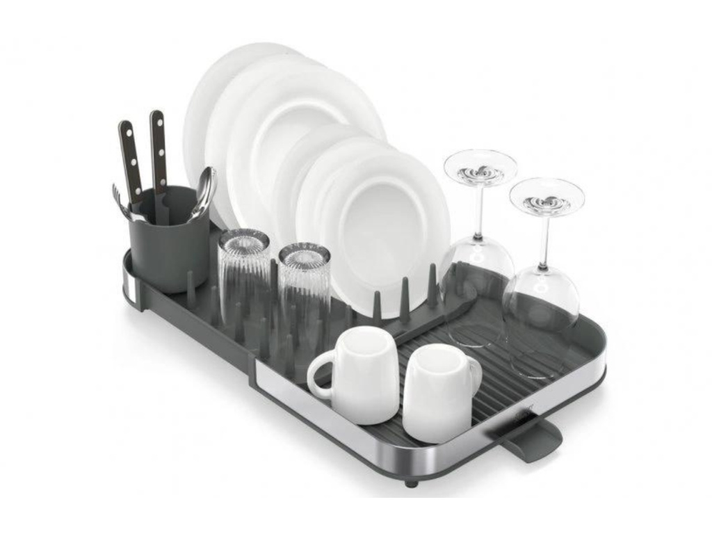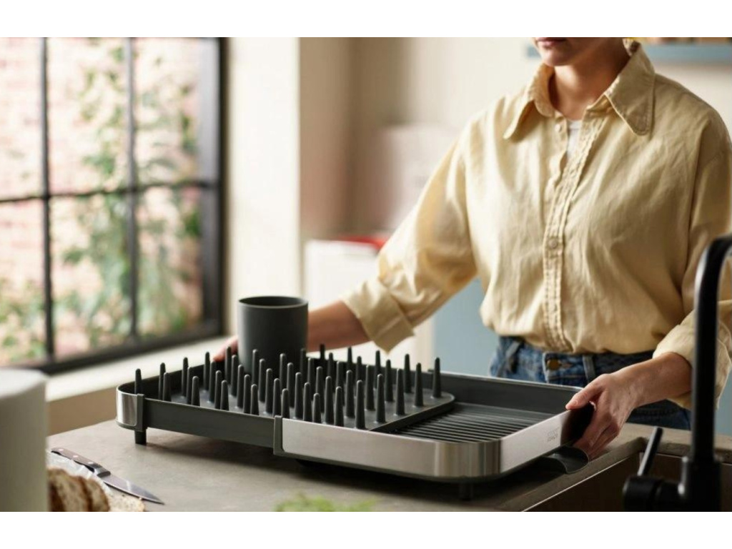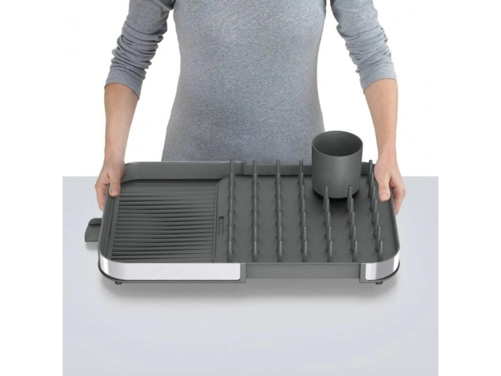 Plastový odkapávač Duo Steel od Joseph Joseph bude nepostradatelným pomocníkem při ručním mytí nádobí. Odkapávač je rozšiřovatelný a v případě potřeby umožňuje snadné zvětšení odkapávací plochy na téměř dvojnásobek původní velikosti. Disponuje také odtokovým uzávěrem s otočnou hubičkou, kterou nasměrujete do dřezu a vypustíte přebytečnou vodu. Nádoba na příbory je odnímatelná. Odkapávač má také protiskluzné nožky, zajišťující jeho stabilitu na pracovní desce.