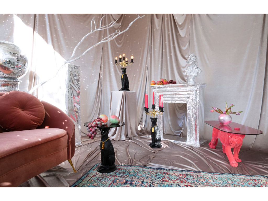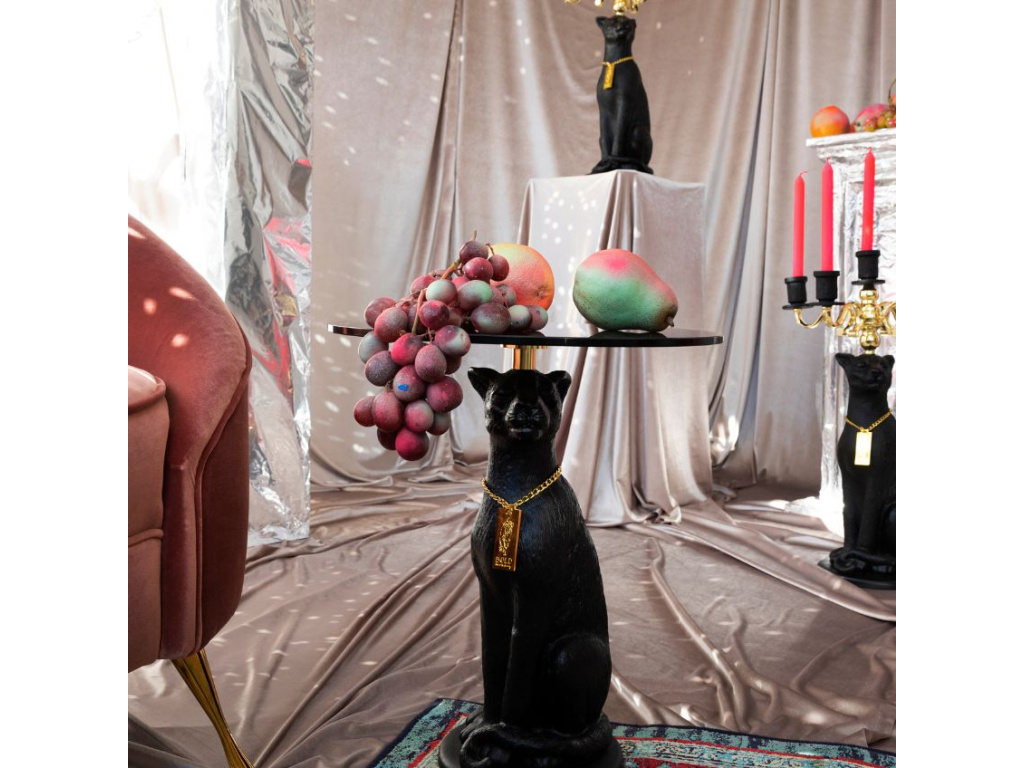 Máte rádi extravagantní kousky, které rozhodně neuniknou pozornosti žádného vašeho hosta? Pak je odkládací stolek Proudly Crowned Panther stvořený právě pro vás. Značka Bold Monkey je svými jedinečnými designovými kousky proslulá - neváhejte i vy jeden z nich přivítat ve svém interiéru! Podstava stolku z černého polyresinu má podobu sedícího pantera, který má nad hlavou skleněnou odkládací desku. Na krku pantera navíc najdete stylový náhrdelník s vyobrazeným logem značky, což přidává stolku na exkluzivitě.