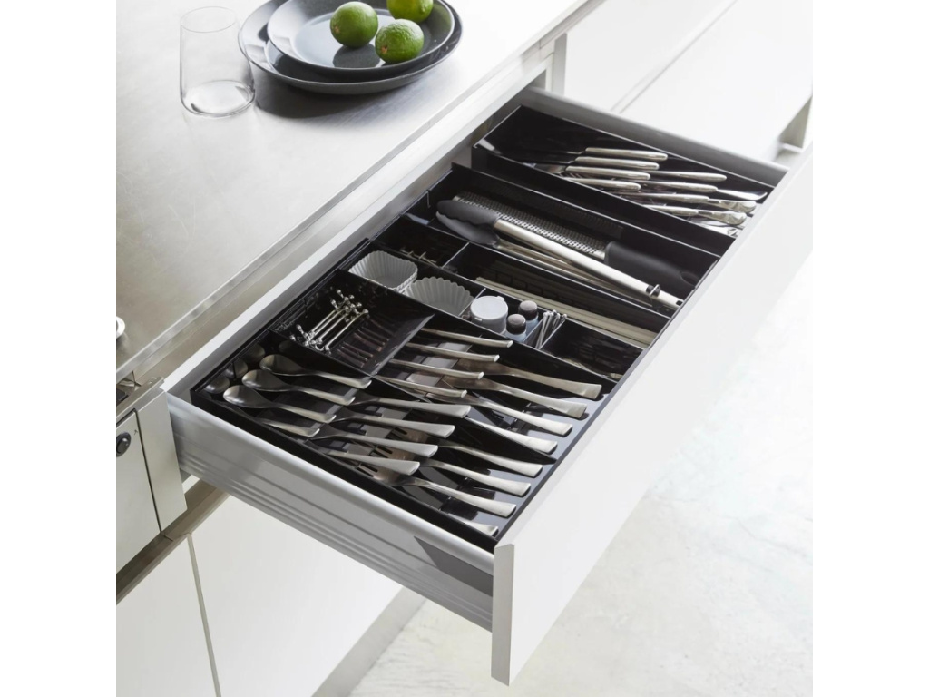 Organizér na příbory Tower od značky Yamazaki je ideální volbou pro každého, kdo chce efektivně využít prostor v kuchyňské zásuvce a zároveň udržet příbory přehledně a snadno dostupné. Tower je vyroben ze zdravotně nezávadného ABS plastu. Také disponuje variabilními rozměry, což umožňuje jeho roztahování a přizpůsobení různým velikostem zásuvek. Tímto způsobem můžete snadno přizpůsobit organizér konkrétním potřebám a prostorovým možnostem vaší kuchyně. Jednou z klíčových vlastností tohoto organizéru je jeho schopnost ukládat příbory pod úhlem. Toto unikátní řešení šetří více než polovinu místa v zásuvce ve srovnání s tradičními plochými organizéry. Jeho moderní vzhled přispívá k estetice kuchyně a zároveň poskytuje praktické řešení pro ukládání příborů.