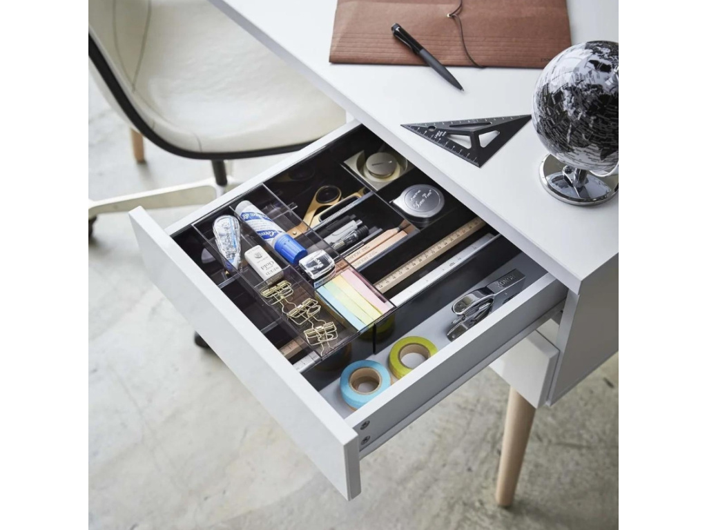 Organizér Tower od značky Yamazaki je praktickým řešením pro udržení pořádku ve vašich kancelářských zásuvkách. Díky nastavitelným přihrádkám se snadno přizpůsobí různým velikostem zásuvek a poskytuje dostatek prostoru pro uspořádání všech vašich kancelářských potřeb. Tower je vyroben z ABS plastu, který je snadno omyvatelný a odolný proti opotřebení. Udržuje kancelářské potřeby, jako jsou pera, tužky, nůžky, sponky a další, přehledně uspořádané a snadno dostupné. Může být také využit pro uspořádání školních potřeb, jako jsou pastelky, fixy a další pomůcky.
