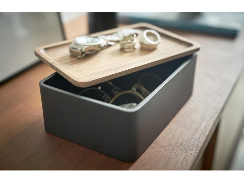 Úložný box Rin od značky Yamazaki je stylové a funkční úložné řešení, které kombinuje moderní design s praktičností. Korpus boxu je vyroben z polystonu, což je plastová pryskyřice s přísadou práškového kamene. Dřevěné víčko přidává přírodní prvek a může sloužit také jako odkladná miska pro drobné předměty. Díky minimalistickému designu se box snadno kombinuje s různými styly interiéru. Rin lze využít v různých místnostech, například v koupelně na kosmetiku, v ložnici na šperky, v předsíni na klíče nebo v pracovně na kancelářské potřeby.
