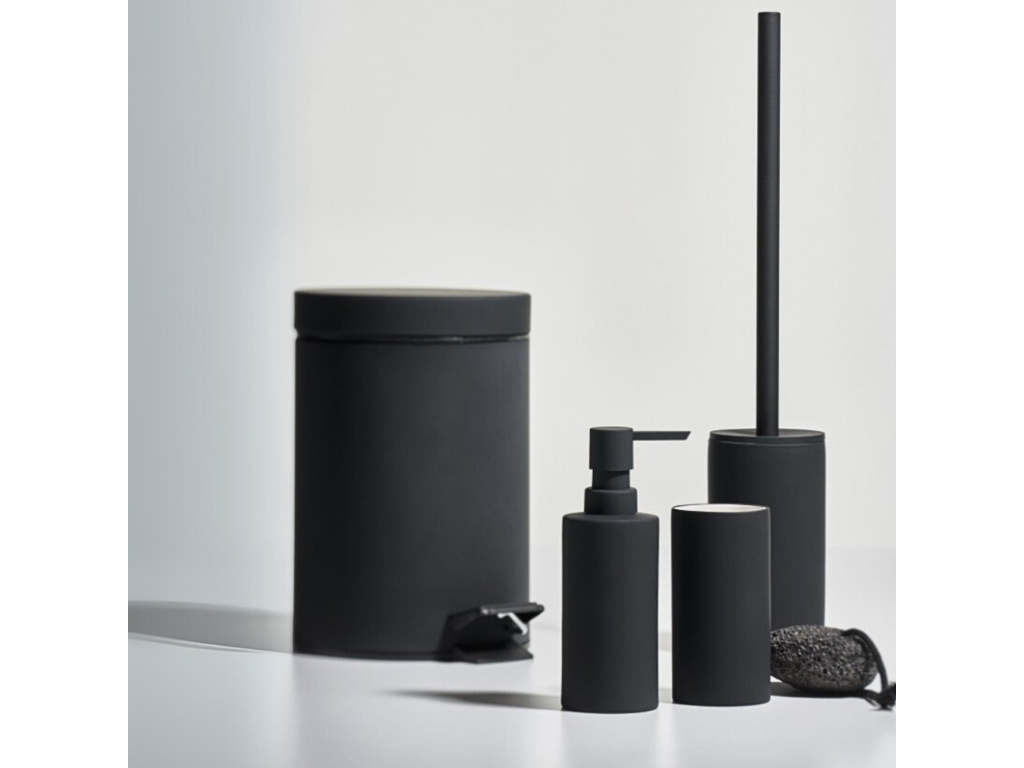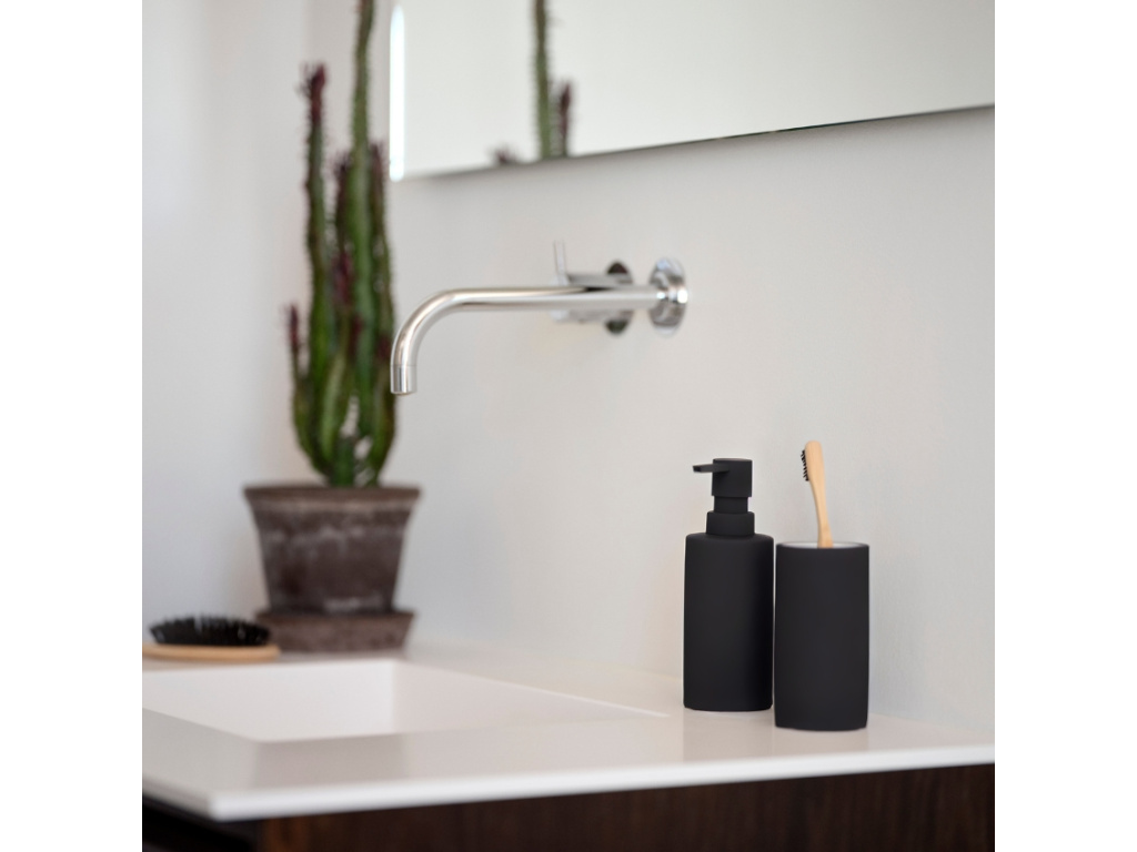 Dávkovač na mýdlo ze série Solo v matně černé barvě se stane elegantním doplňkem každé moderní koupelny. Je vyroben z porcelánu s povrchovou úpravou soft-touch, která vytváří příjemný a luxusní pocit na dotek. Dávkovač má objem 300 ml, a kromě koupelny se skvěle hodí i ke kuchyňskému dřezu jako elegantní a nenápadná nádoba na saponát. Kolekce Solo zahrnuje také stojan na zubní kartáčky, WC štětku a odpadkový koš, přičemž všechny produkty jsou dostupné ve více barevných provedeních, což umožňuje sladit doplňky s interiérem k úplné dokonalosti.