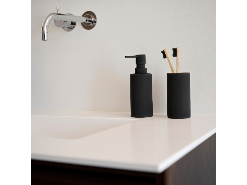 Dávkovač na mýdlo ze série Solo v matně černé barvě se stane elegantním doplňkem každé moderní koupelny. Je vyroben z porcelánu s povrchovou úpravou soft-touch, která vytváří příjemný a luxusní pocit na dotek. Dávkovač má objem 300 ml, a kromě koupelny se skvěle hodí i ke kuchyňskému dřezu jako elegantní a nenápadná nádoba na saponát. Kolekce Solo zahrnuje také stojan na zubní kartáčky, WC štětku a odpadkový koš, přičemž všechny produkty jsou dostupné ve více barevných provedeních, což umožňuje sladit doplňky s interiérem k úplné dokonalosti.