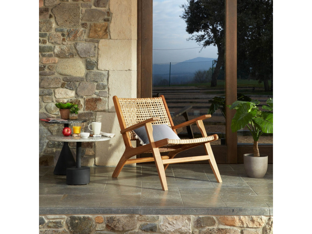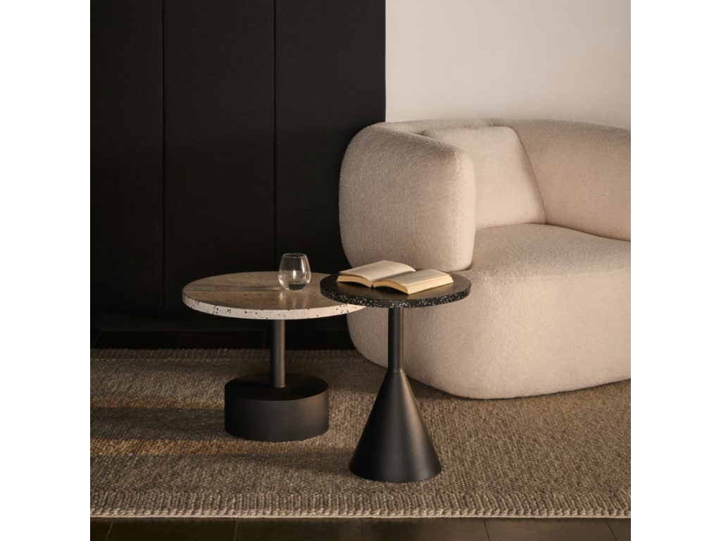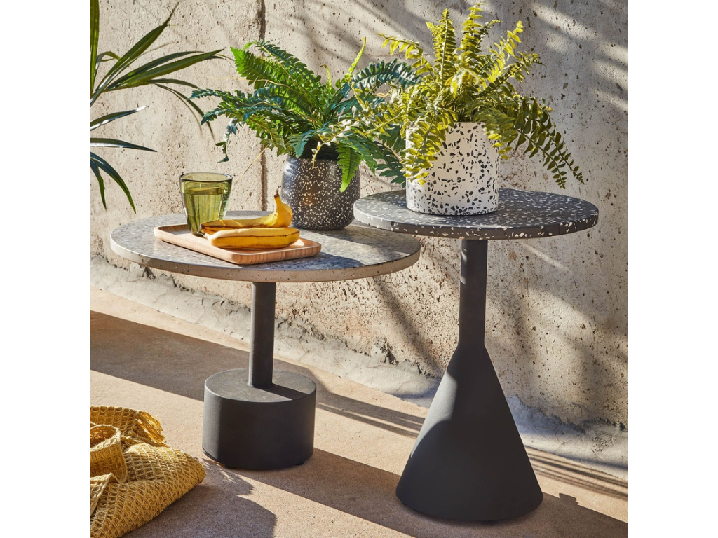 Odkládací stolek Kave Home Delano na první pohled zaujme neobvyklou úpravou desky v provedení terrazzo. Jedná se o směs drcených kamenů, keramiky a dalších příměsí, které vytváří kvalitní a především originální motivy i strukturu. Díky tomu je stolek vhodný nejen do interiérů, ale také do krytých exteriérů.