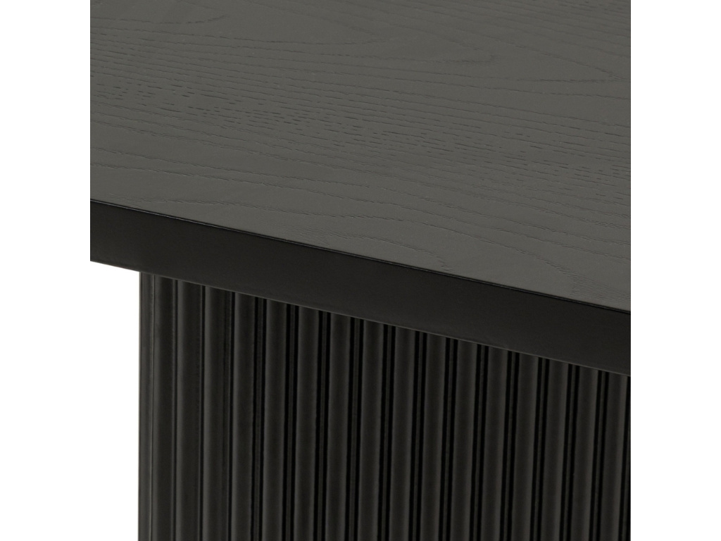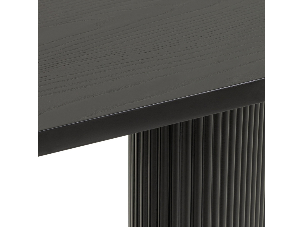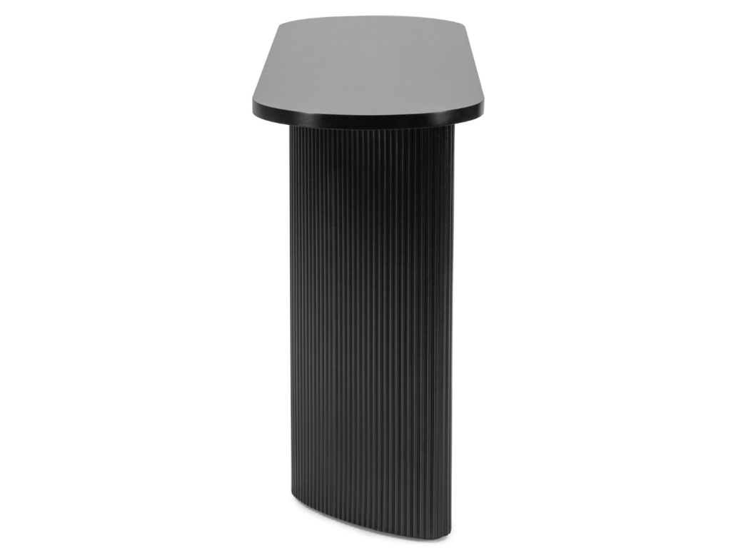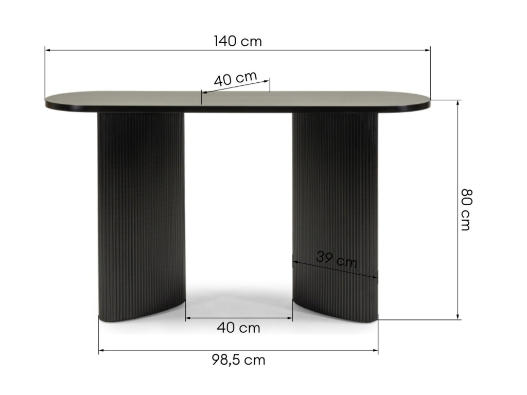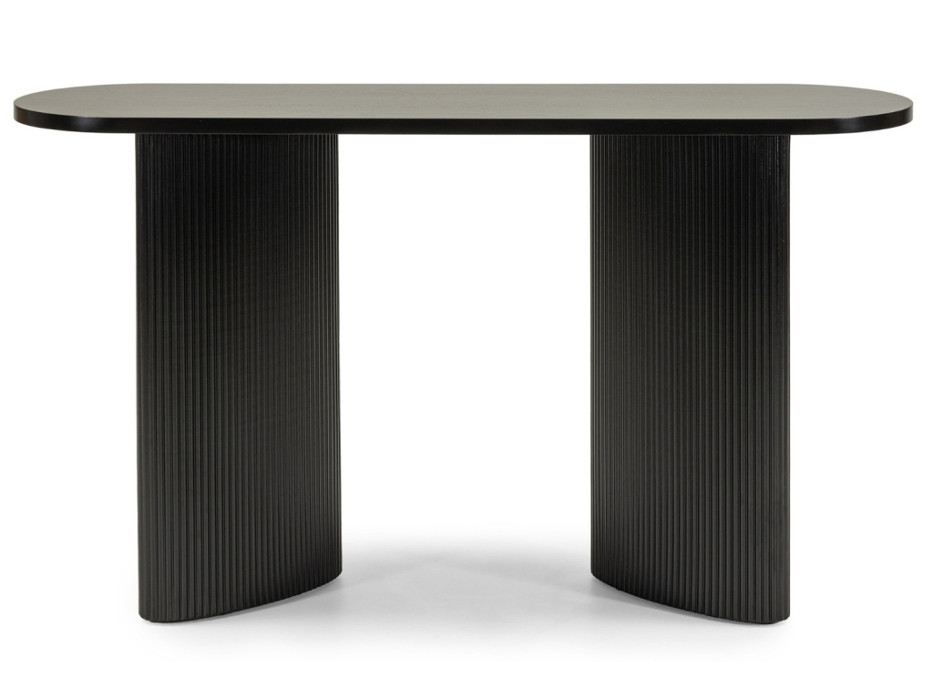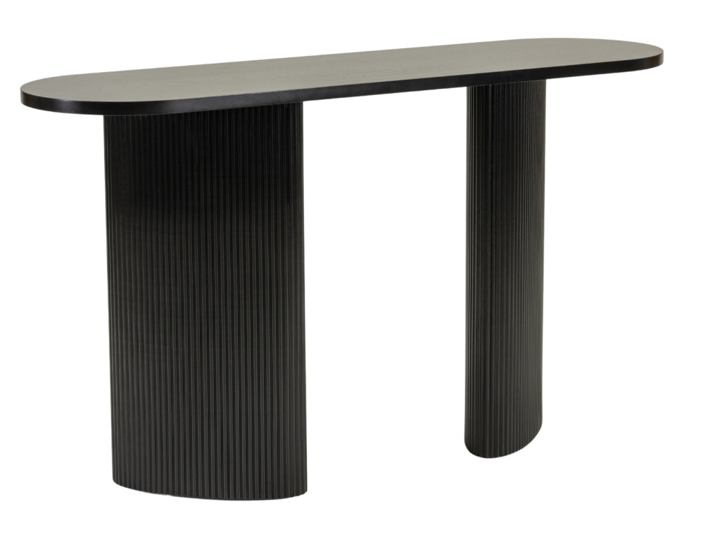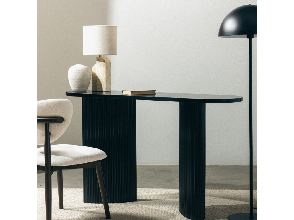 Konzolový stolek Alrequin v černém provedení přináší do interiéru sofistikovaný kontrast a nadčasový styl. Jeho oválná deska o tloušťce 2,5 cm působí lehce a elegantně, zatímco dvoudílná lamelová podnož tvoří výrazný, architektonicky laděný prvek, který okamžitě upoutá pozornost. Díky svému minimalistickému designu a elegantním proporcím se Alrequin skvěle hodí jako toaletní stolek, pracovní plocha nebo stylový odkládací a výstavní prostor do předsíně či chodby. Vyrobený je z MDF, kombinuje trvanlivost s precizním zpracováním, které podtrhuje jeho moderní, minimalistický vzhled.