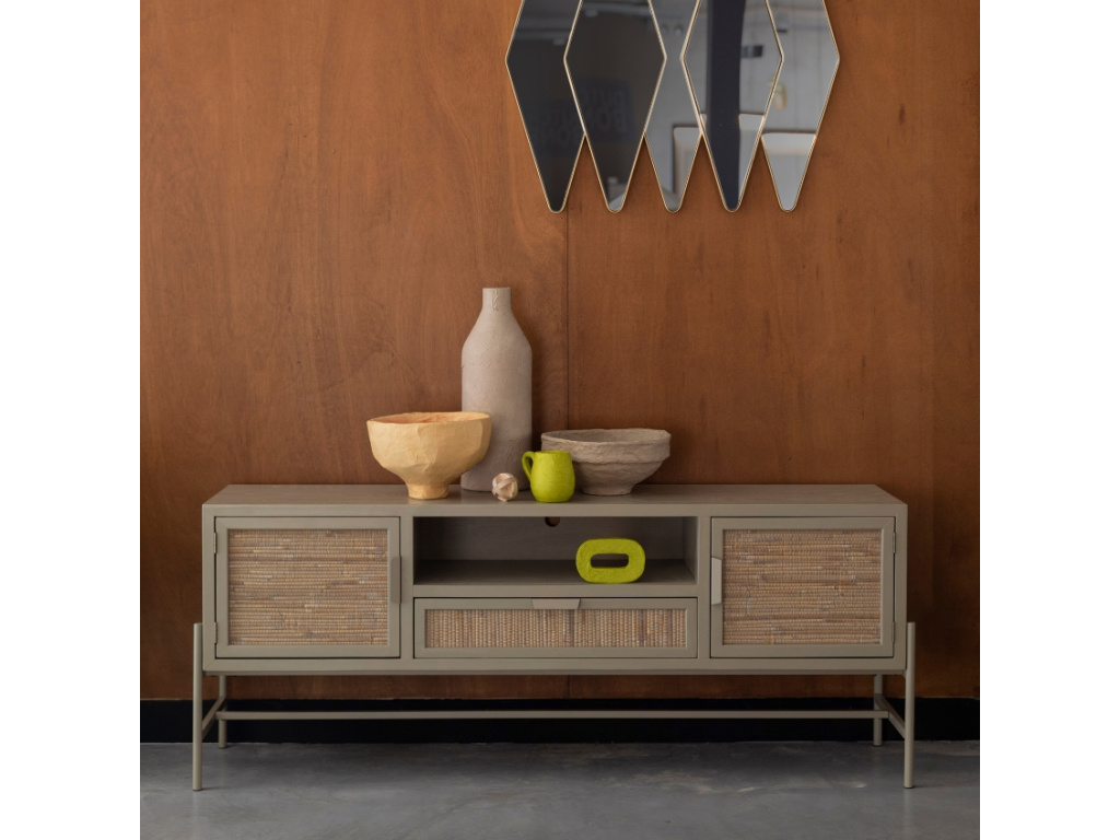 TV stolek YASU od holandské značky DUTCHBONE zaujme svým originálním designem. Je vyroben z lakované dýhy z čínské jedle s dekorem z ratanového výpletu, což dodává stolku nádech exotiky. Stabilitu zajišťuje minimalistická kovová podnož stejné barvy jako korpus. YASU nabízí dostatek úložného prostoru na oblíbené časopisy, knihy a elektroniku. Zadní strana stolku je opatřena praktickým kulatým otvorem, kterým snadno vyvedete všechny kabely.