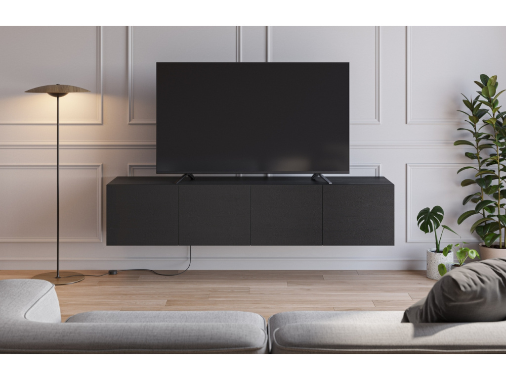 Závěsný TV stolek Daroca s dřevěným dekorem v černém laku působí elegantně a výrazně zároveň. Minimalistické provedení bez úchytek se skvěle hodí do moderních i industriálně laděných interiérů. Kvalitní melaminový povrch je odolný a snadno se udržuje, zatímco vnitřní prostor za dvířky poskytuje praktické úložné řešení. Tento model je dostupný ve třech barevných variantách.