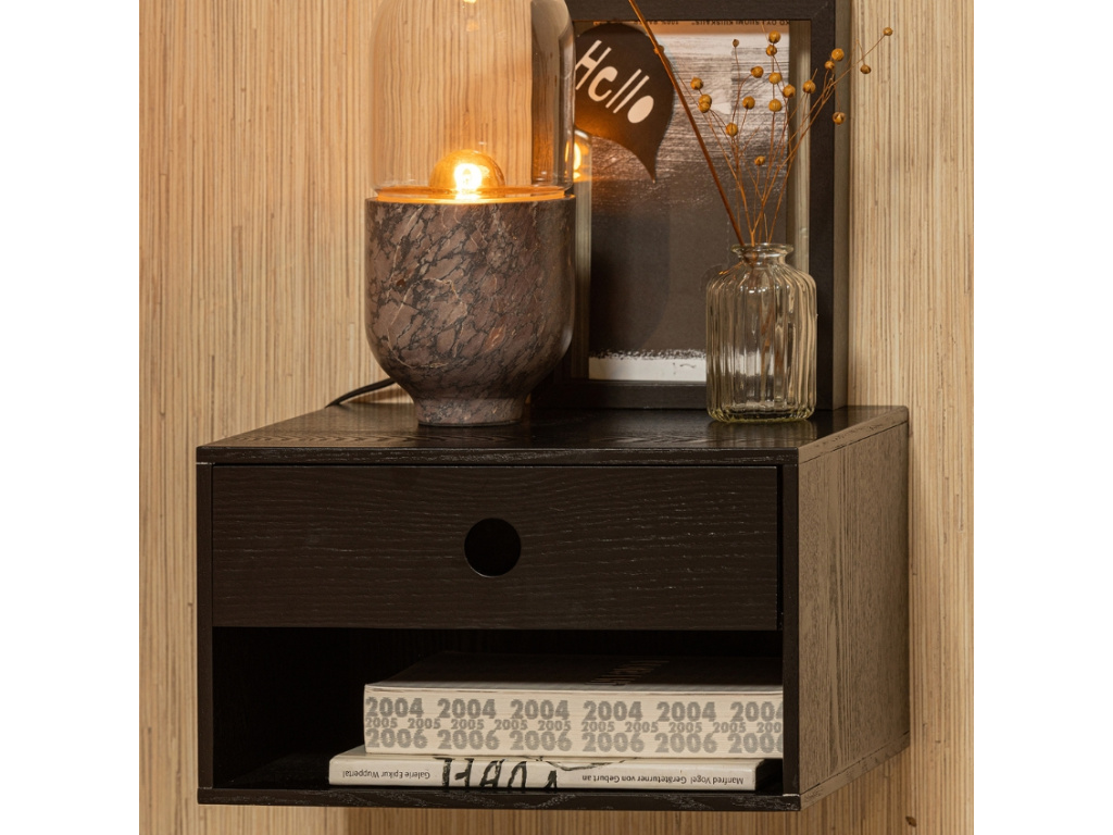 Jednoduchost a praktičnost – přesně tak by se dal popsat závěsný noční stolek Ancy. Jednoduchý obdélníkový korpus, vyrobený z černě lakovaného MDF, je doplněný jednou zásuvkou a úložnou policí. Do nočního stolku se tak pohodlně vejdou knihy, kosmetika nebo časopisy. Díky své velikosti se stolek hodí především do menších prostorů.