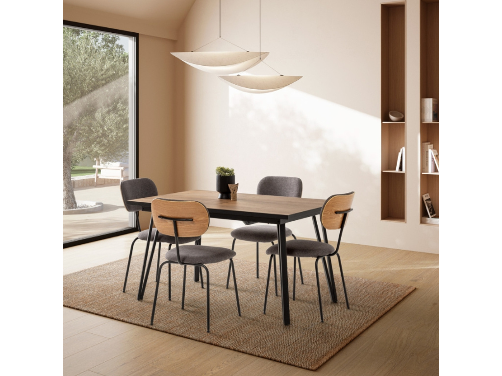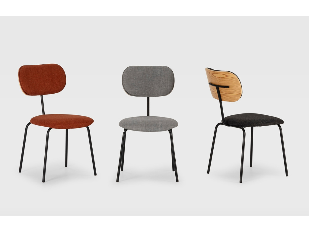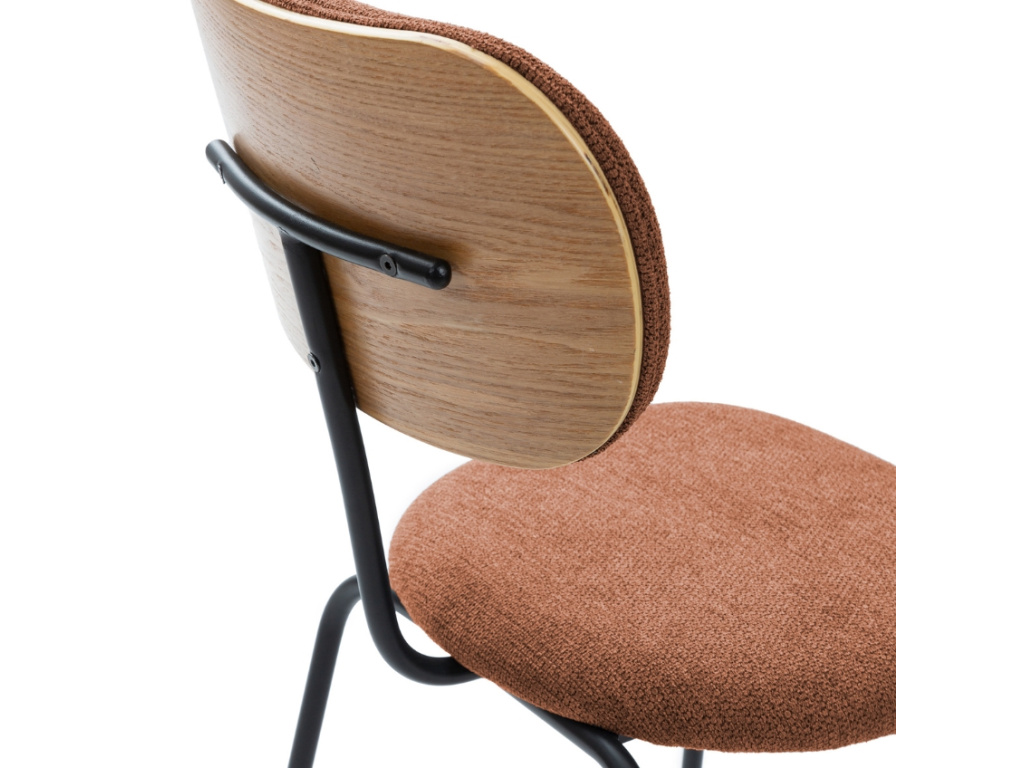 Jídelní židle Dash v terakotovém odstínu působí živě a optimisticky, přičemž si zachovává jednoduchou formu. Sedák i opěrka jsou čalouněné a orámované dřevěnou překližkou, která židli dodává přírodní nádech. Tenká černá podnož vytváří elegantní kontrast a zajišťuje vizuální lehkost. Židle Dash je dostupná ve čtyřech barevných variantách.