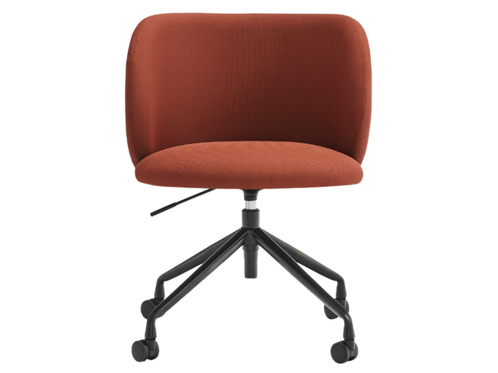 Hledáte designovou kancelářskou židli, která působí elegantně a luxusně? Čalouněná konferenční židle Mogi od španělské značky Teulat je skvělou volbou do salonů krásy nebo designových kanceláří. Otočná červená židle na kolečkách s pohodlným širokým sedákem poskytne vám či vašim hostům maximální komfort. Zaoblená měkká opěrka vás příjemně obejme a poskytne pohodlnou oporu zad i při delším sezením. Vkusné čalounění kvalitní polyesterovou, recyklovanou látkou je doplněno kontrastní černě lakovanou, kovovou podnoží se čtyřmi rameny zakončenými kolečky. Pod sedákem najdete praktickou páku, se kterou snadno nastavíte výšku židle. Oceníte jistě také certifikaci a evropskou normu nehořlavosti (EN 1021 1&2).