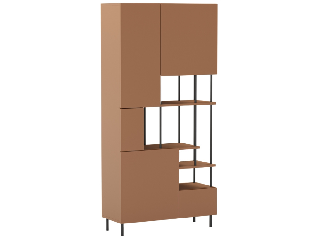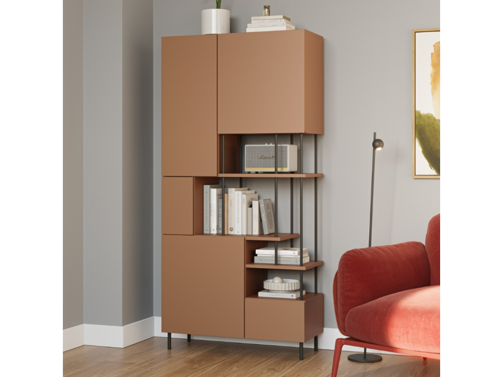 Knihovna Perla od značky Marckeric zaujme architektonickým pojetím a asymetrickým rytmem otevřených i uzavřených úložných prostor. Terakotově červený lak na MDF deskách vytváří jemný kontrast s černě lakovanou kovovou konstrukcí, která působí vzdušně a elegantně. Police i skříňky různých velikostí nabízejí prostor pro knihy, dekorace i praktické drobnosti, které chcete mít stylově uschované. Kolekce Perla je dostupná ve třech barevných variantách – kromě červené také v zelené a béžové.