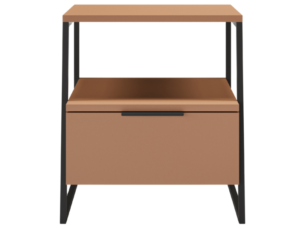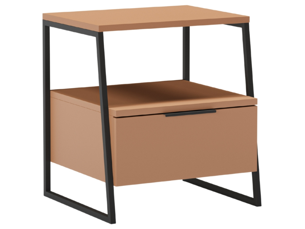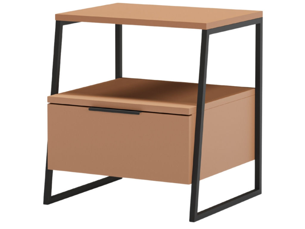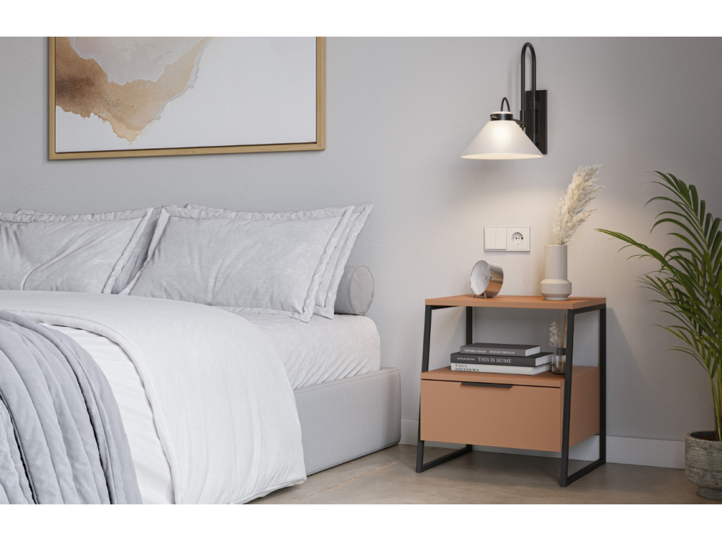 Noční stolek Velia zaujme kombinací matného lamina v terakotově červeném odstínu a černé kovové konstrukce, která mu dodává lehký industriální nádech. Otevřená police je ideální na knihu či telefon, zatímco hlubší zásuvka pojme všechny drobnosti, které chcete mít při ruce, ale ne na očích. Díky kompaktním rozměrům se hodí i do menších ložnic, kde oceníte každé praktické řešení. Stolek je dostupný ve třech barevných variantách, které snadno sladíte s interiérem.