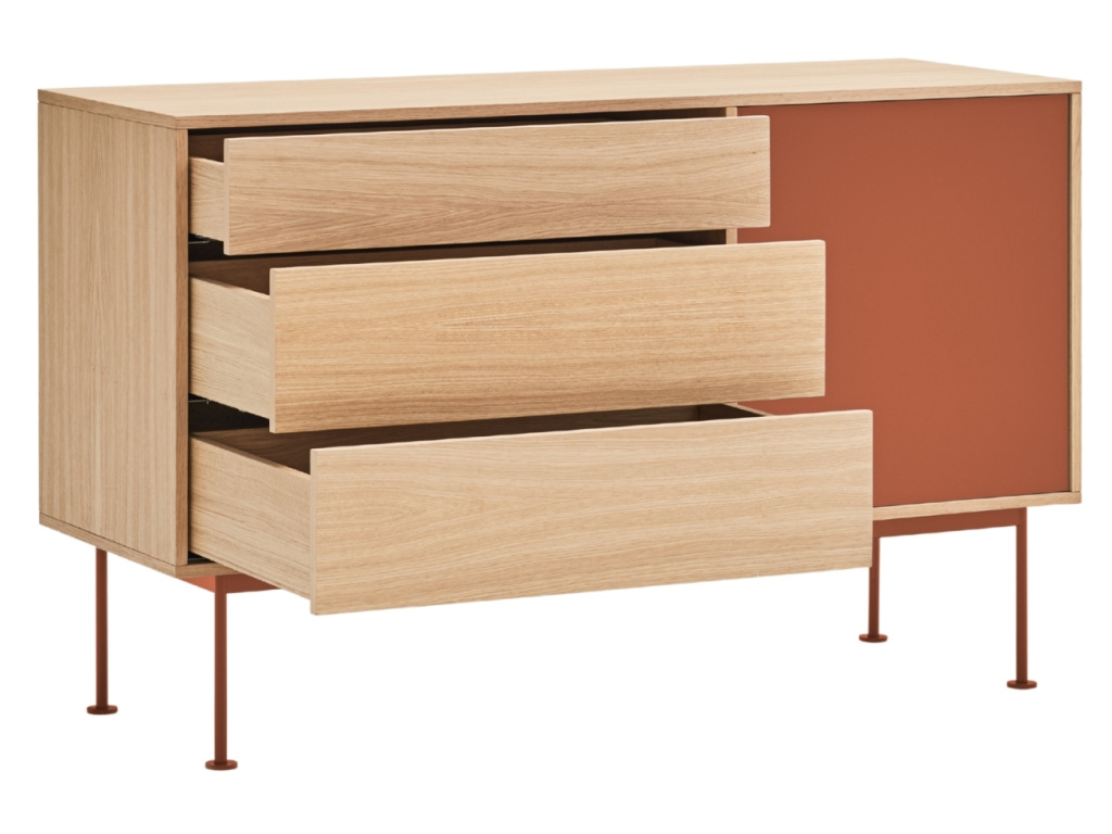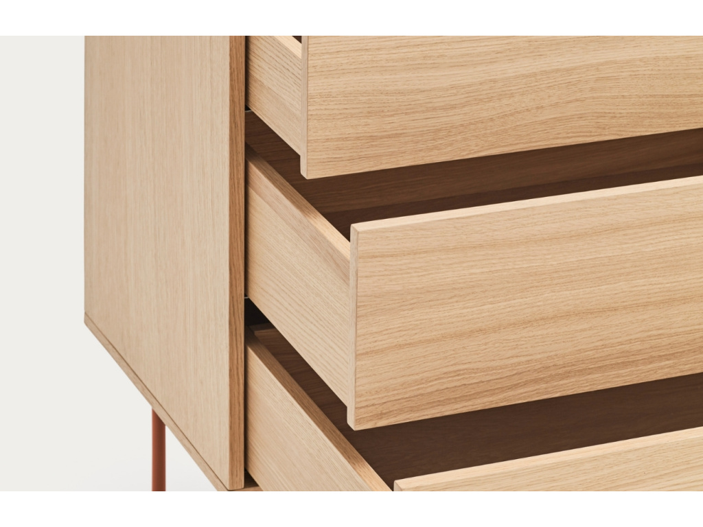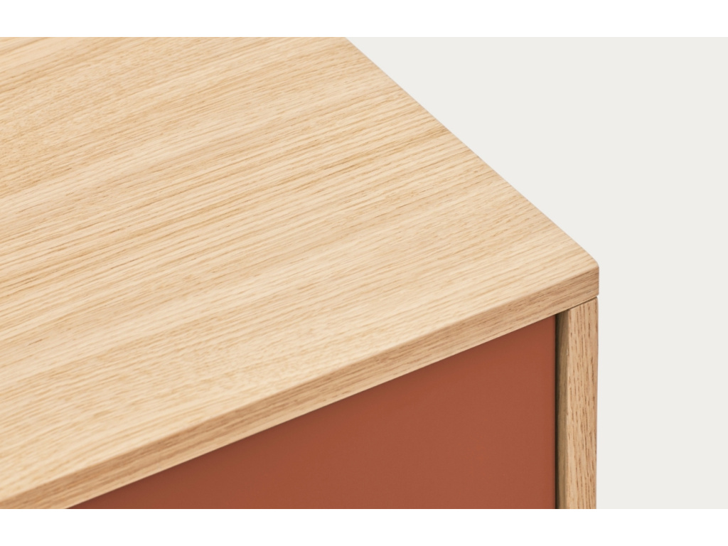 Stylová komoda Teulat Yoko zaujme na první pohled svým neobyčejným designem. Kombinace korpusu z dubové dýhy, dvířek z lakované MDF v cihlově červené barvě a kovové podnože ve stejné barvě vnese do vašeho interiéru moderní a trendy prvek. Komoda disponuje 2 uzavřenými policemi a 3 prostornými zásuvkami, které vytváří praktické a prostorné úložiště, kam pohodlně uložíte váš inventář. Komoda se skvěle hodí do moderních interiérů. Doporučujeme kombinovat s dalšími produkty z řady Yoko.