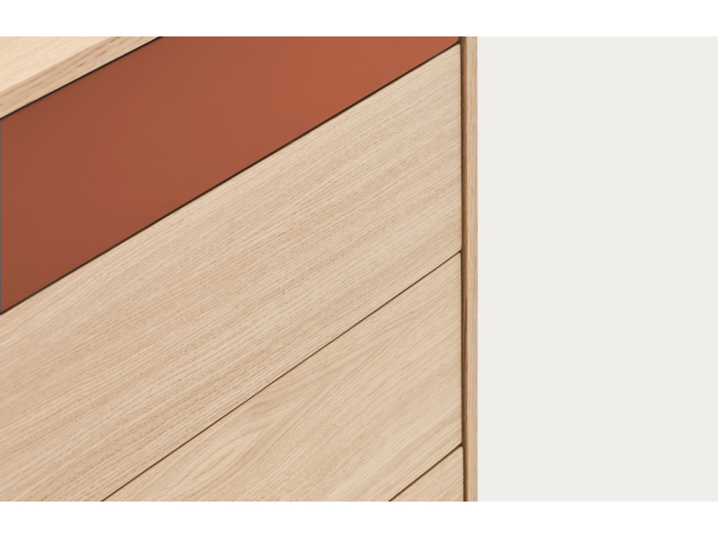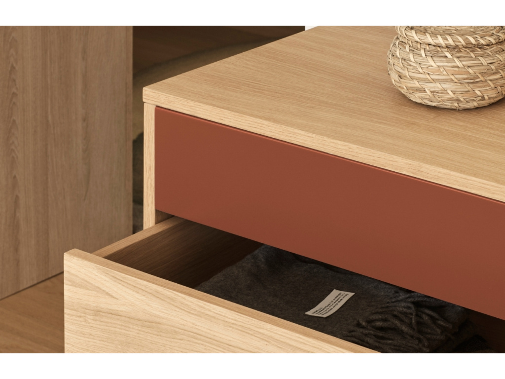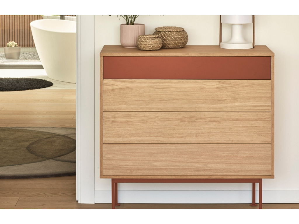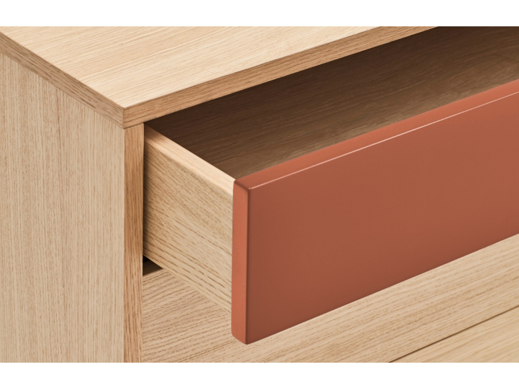 Stylová komoda Teulat Yoko zaujme na první pohled svým neobyčejným designem. Kombinace korpusu z dubové dýhy, zásuvky z lakované MDF v cihlově červené barvě a kovové podnože ve stejné barvě vnese do vašeho interiéru moderní a trendy prvek. Komoda disponuje 4 prostornými zásuvkami, které vytváří praktické a prostorné úložiště, kam pohodlně uložíte váš inventář. Komoda se skvěle hodí do moderních interiérů. Doporučujeme kombinovat s dalšími produkty z řady Yoko.