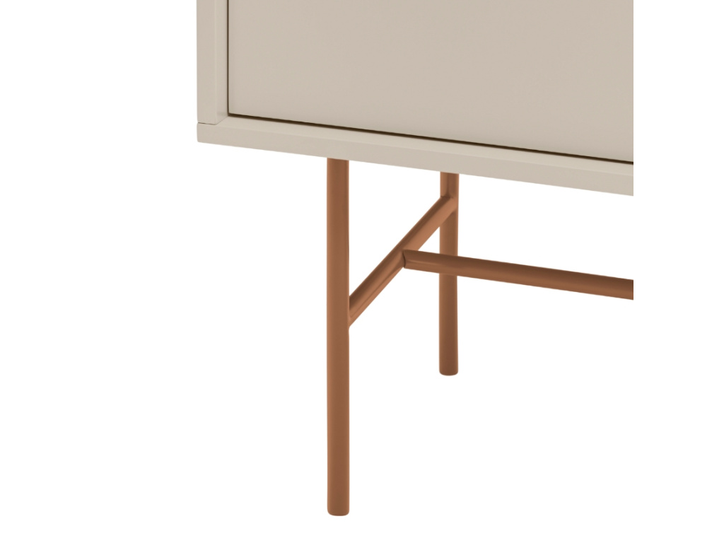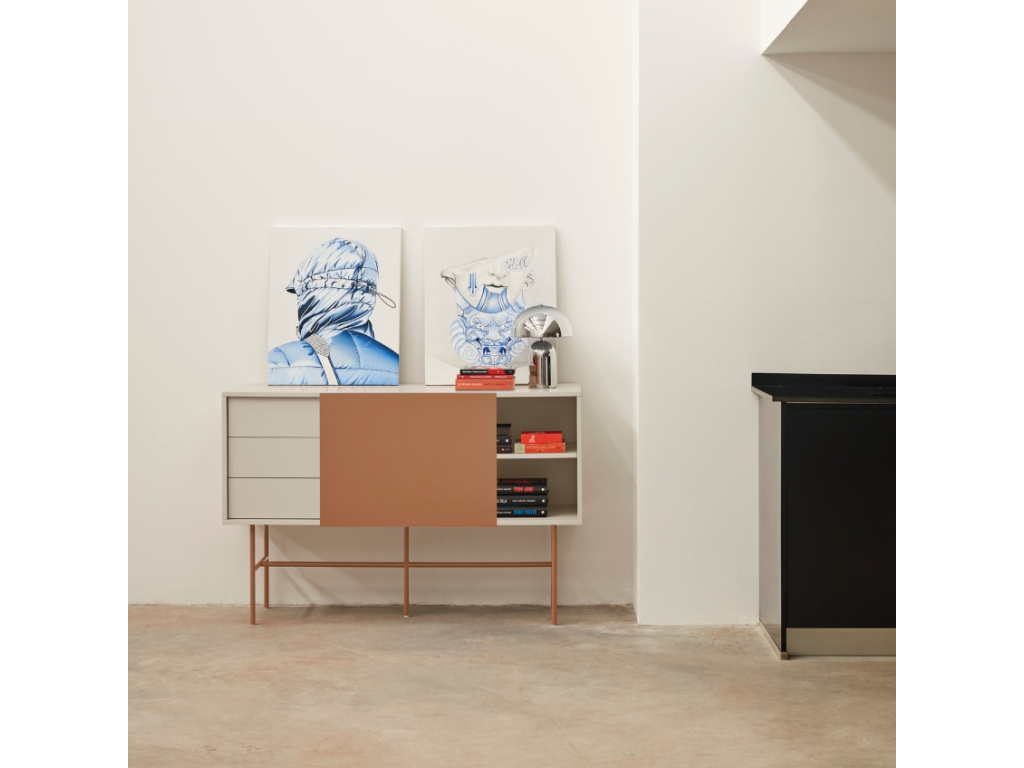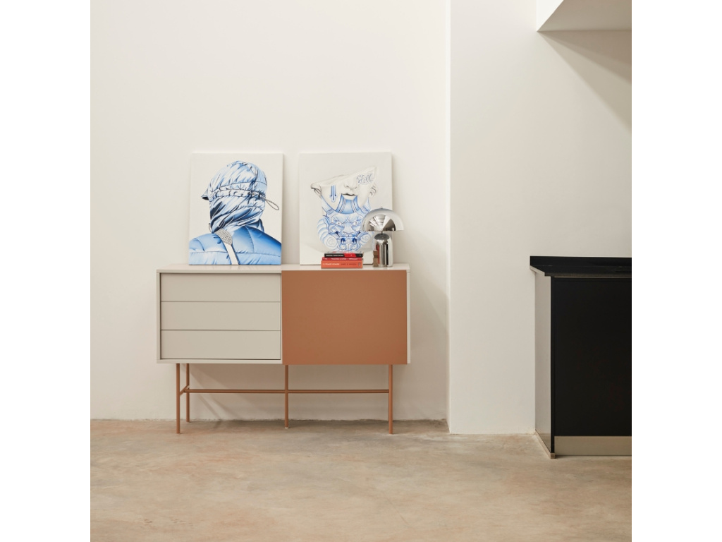 Minimalistická komoda Nube od španělské značky Teulat vás oslní elegantním designem i praktickým uspořádáním věcí. Designová komoda v cihlově červené a béžové barvě se skládá ze 3 šuplíků a 2 prostorných polic, které můžete zakrýt posuvnými dveřmi. Ať už se tak rozhodnete využít úložný prostor na cokoliv, můžete se spolehnout na diskrétní ukrytí vašich pokladů před zraky ostatních. Díky bezúchytkovému provedení vyniknou jednoduché a čisté linie komody. Praktický systém Push to open zase zajistí, že zásuvky a dvířka snadno otevřete i bez úchytek. Použité lakované MDF vás jistě potěší snadnou údržbou a vysokou odolností. Nelze opomenout ani cihlově červenou kovovou podnož, díky které budete mít věci hezky po ruce bez zbytečného ohýbání. Komodu nabízíme ve třech barevných provedeních.